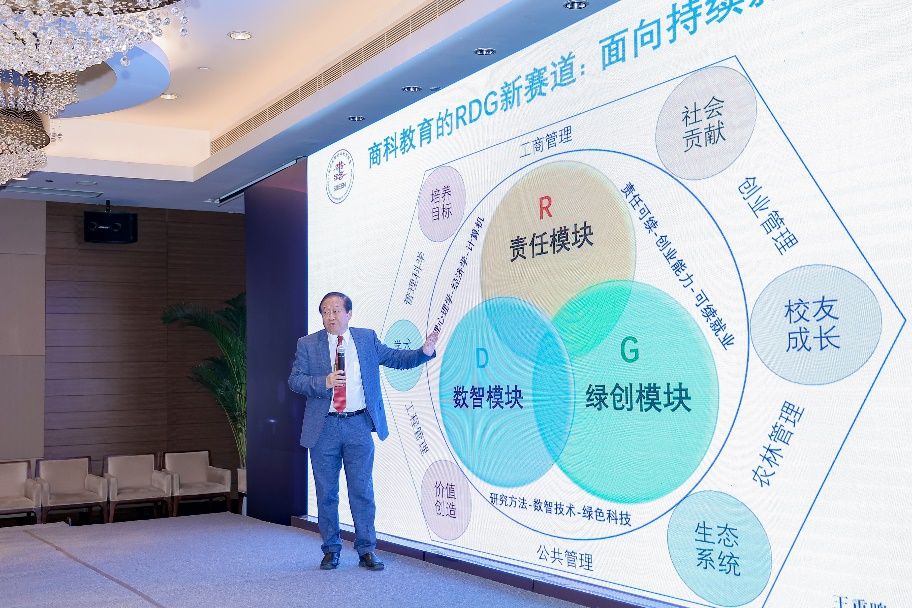 王重鸣教授做了主题为《新的展望》的演讲,王教授回顾AMBA&BGA认证近两年在中国的工作,并提出了“Arena竞技场”的新赛道概念,他认为,商学教育模块化的体系需要进行一些根本性的改革,智慧贡献、价值创造、生态系统、校友成长都应该成为商学院的使命要素,并建议课程从教学力、研究力、就业力三大框架进行思考,从责任模块、数智模块、绿创模块三大课程模块进行改革和探索。