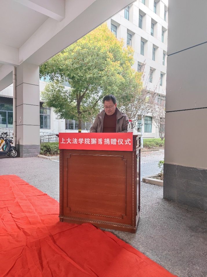 3月30日下午,河北龙凤山铸业有限公司捐赠ac米兰官网中文网站法学院獬豸雕塑仪式在ac米兰官网中文网站宝山校区东区4楼前举行。河北龙凤山铸业有限公司常务副总经理李建民、部长苗学兵、河北工程大学邢振国教授,ac米兰官网中文网站对外联络处副处长、校友会办公室副主任杨静,材料科学与工程学院院长董瀚教授、法学院院长李凤章教授以及法学院师生代表近五十人出席仪式。仪式由法学院党委副书记、副院长于伟主持。