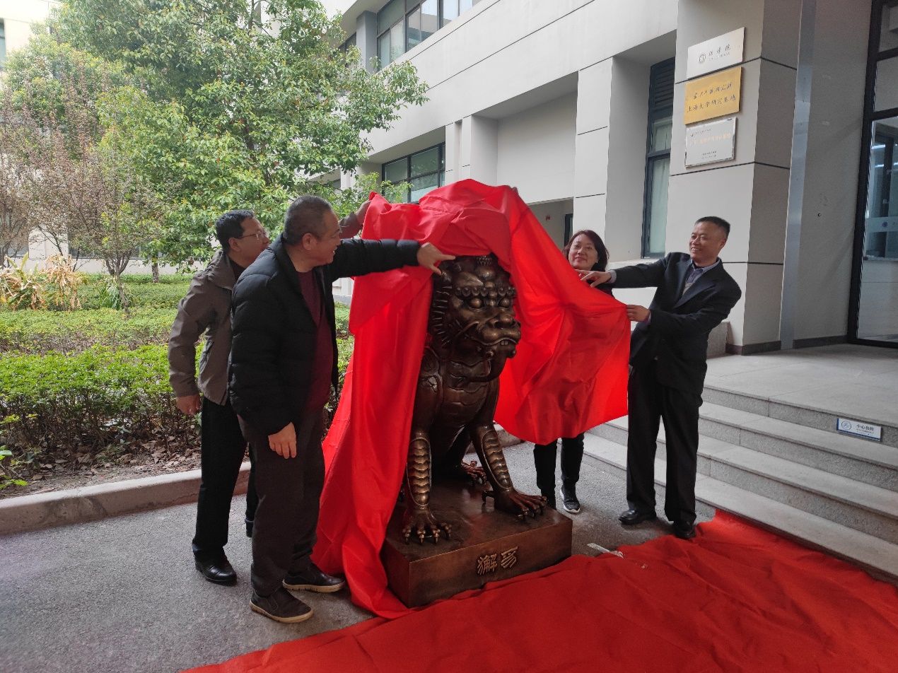 河北龙凤山铸业有限公司常务副总经理李建民、对外联络处副处长、校友会办公室副主任杨静、材料学院院长董瀚、法学院院长李凤章共同为獬豸雕塑揭幕。掌声中,象征中华法律的图腾、昭示着司法的清明与公正的獬豸展现在大家眼前。
