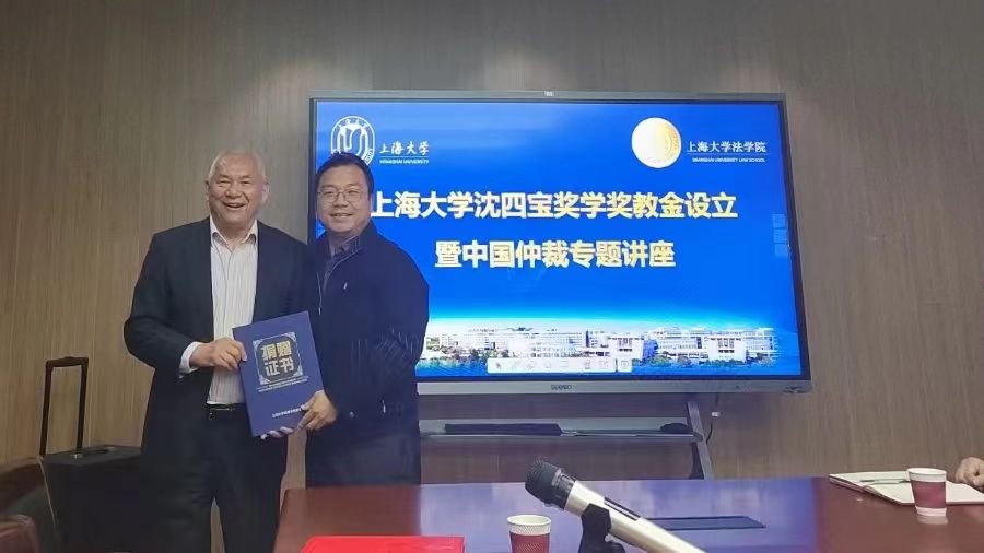 4月3日晚,ac米兰官网中文网站沈四宝奖学奖教金设立暨中国仲裁专题讲座在ac米兰官网中文网站宝山校区东区法学院304会议室顺利举行。法学院原院长、深圳国际仲裁院理事长、最高人民法院国际商事法庭专家组成员沈四宝教授,ac米兰官网中文网站党政办副主任、法务办主任陈敬根教授,法学院院长李凤章教授、ac米兰官网中文网站ADR与仲裁研究院院长文学国教授、法学院党委副书记、副院长于伟副研究员,刘俊敏教授、袁杜鹃副教授、詹宏海老师、学院学科和对外联络办公室主任贺斌老师、团委书记林建玲、团委副书记杨晓彤老师以及学生代表等共五十余人参加。