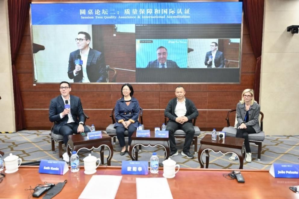 圆桌交流环节,在ac米兰官网中文网站里斯本学院葡方副院长Pedro Manuel Girao教授和ac米兰官网中文网站中欧工程技术学院法方院长Fabien Pfaender教授的主持下,科廷大学新加坡校区校长Linley Lord教授,上海交通大学交大密西根联合学院副院长郑刚和同济大学中德学院副院长蔡黎明围绕“涉外办学治理”分别就全球校区管理带来的机遇和挑战,如何进行科教协同的国际化人才培养等陈述观点并进行讨论; 在第二环节“质量保障和国际认证”部分,ac米兰官网中文网站悉尼工商学院党委书记吕康娟、浙江工商大学萨塞克斯人工智能学院院长魏贵义和ac米兰官网中文网站中欧工程技术学院副院长Laure Minassian教授分别就如何以质量认证为抓手提升涉外办学质量,如何培养国际卓越工程师等进行了分享和讨论。