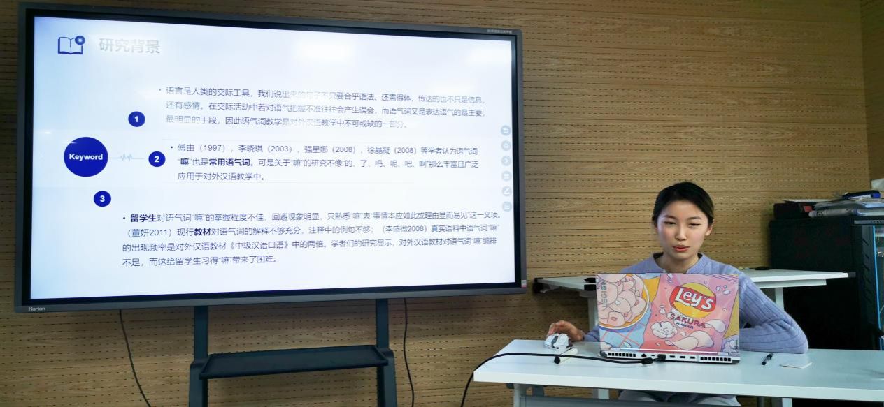 第二项课题是汉语国际教育专业22级学生张子京同学“关于语气词‘嘛’的偏误研究”。张子京同学介绍了研究的背景与意义、内容与拟采用的方法,并就一些困惑向崔希亮教授及在座的老师们请教。崔老师介绍了与语气词相关的知识,如语气词的情态意义,不同母语背景对学生习得汉语语气词的影响等,并对论文题目的表述、调查问卷的设计、偏误分析时的注意事项等方面提出宝贵意见。