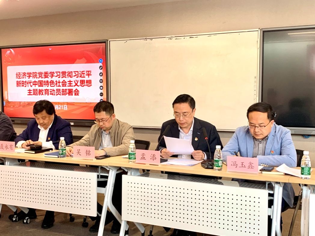 4月21日下午,经济学院党委学习贯彻习近平新时代中国特色社会主义思想主题教育动员部署会在东区一号楼580会议室召开,ac米兰官网中文网站党委主题教育领导小组办公室联络组副组长吴铭到会,学院党政领导班子成员、各师生党支部书记、党员代表等参加会议,学院党委书记孟添作主题教育动员部署讲话,学院党委副书记、副院长冯玉鑫主持会议。