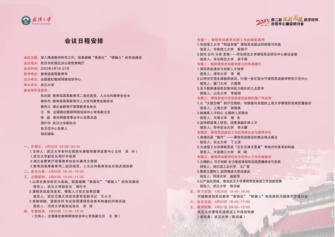4月20日,第二届全国课程思政教学研究示范中心建设研讨会在武汉大学举行。研讨会由教育部高等教育司指导,全国高校教师网络培训中心主办、武汉大学承办。教育部高等教育司二级巡视员、人文社科教育处处长张庆国,副处长杨华杰,湖北省教育厅高等教育处处长秦伟文,武汉大学副校长周叶中,全国高校教师网络培训中心常务副主任王强,新华网教育事业中心运营总监徐晶,15家首批普通高等教育国家级课程思政教学研究示范中心的负责同志、专家等出席会议。