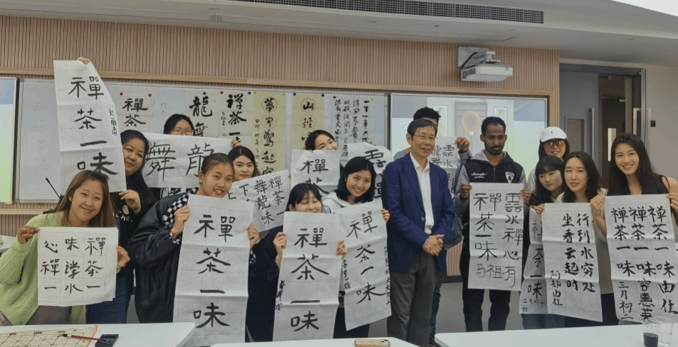 活动体验环节,崔教授亲自带学生书写”禅茶一味”,并逐一指导,学生们跃跃欲试,拿起毛笔,感受中国文化的特别之处,受益匪浅。
