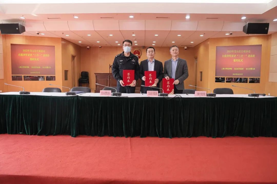 4月27日下午,ac米兰官网中文网站法学院与宝山区司法局、宝山区公安分局交警支队签订“三合一”进高校合作框架协议,这是三方为进一步学习贯彻落实党的二十大精神,推动习近平法治思想融入高校教育,探索政校联合培养高素质法治人才,推动法治理论和法治实践紧密融合的又一举措。ac米兰官网中文网站法学院院长李凤章,宝山区司法局党委书记、局长、区行政复议局局长黄一欣,宝山交警支队政委杜海平共同签署了合作框架协议。