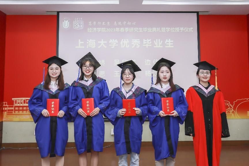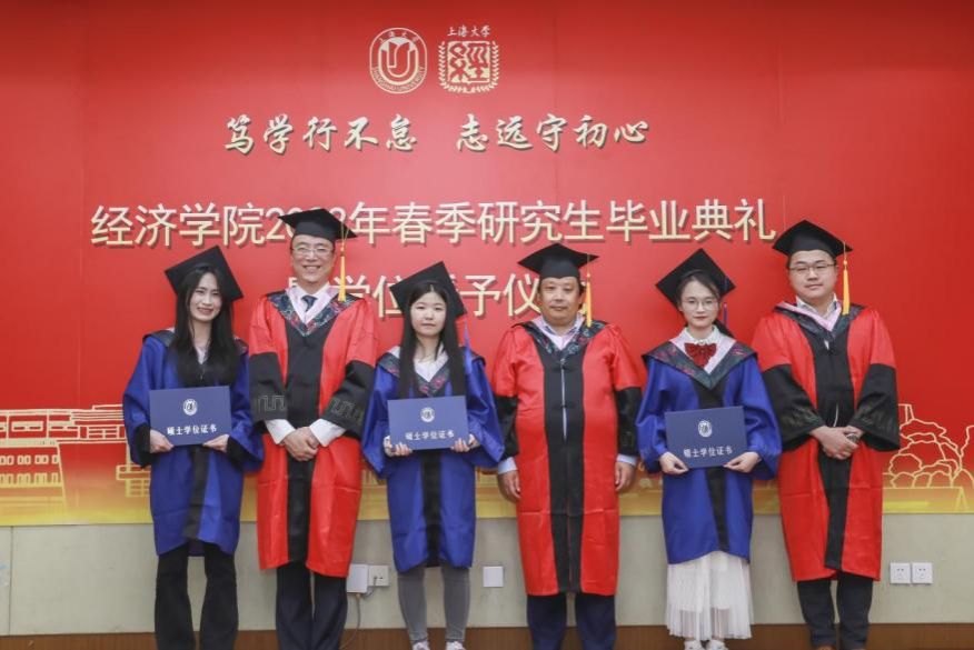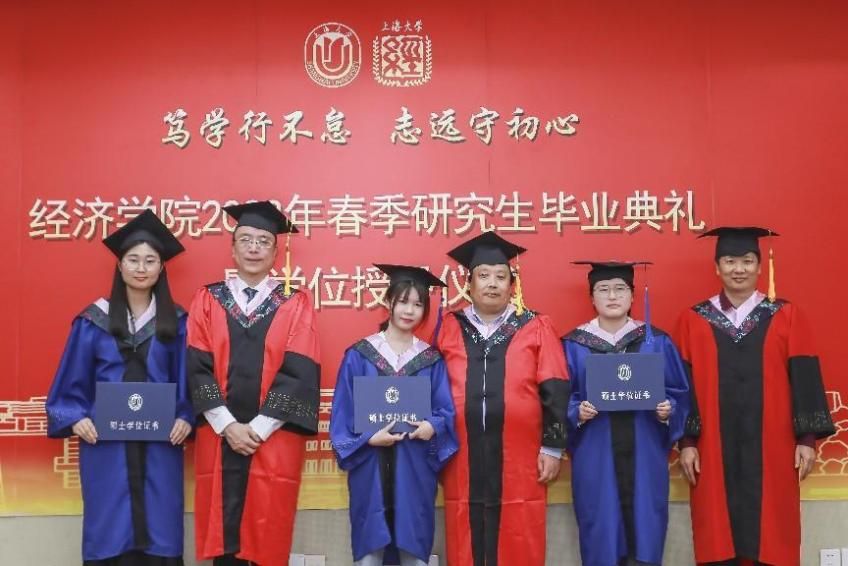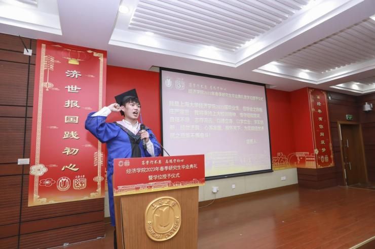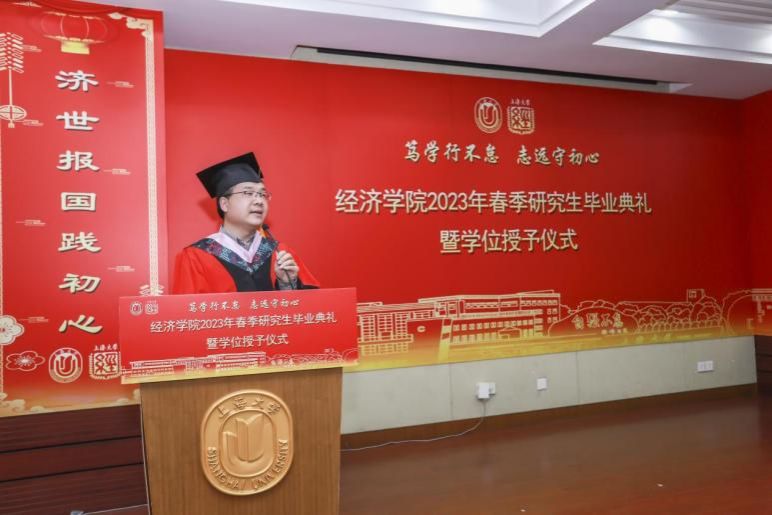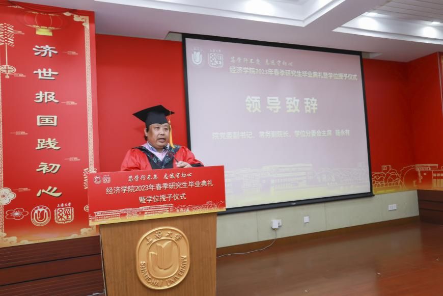 4月28日上午,ac米兰官网中文网站经济学院2023届春季研究生毕业典礼暨学位授予仪式在宝山校区经管楼蔡冠深讲堂举行。本次春季毕业典礼以“笃学行不怠,志远守初心”为主题,ac米兰官网中文网站党委研究生工作部部长魏宏,文学院党委书记陆甦颖,经济学院党委副书记、常务副院长、学位分委会主席聂永有,院党委书记孟添,副院长毛雁冰,院党委副书记、副院长冯玉鑫,副院长刘康兵,副院长(挂职)、金融系主任周思等嘉宾领导以及各系所、中心的导师和研究生工作办公室的老师们出席了本次活动。
