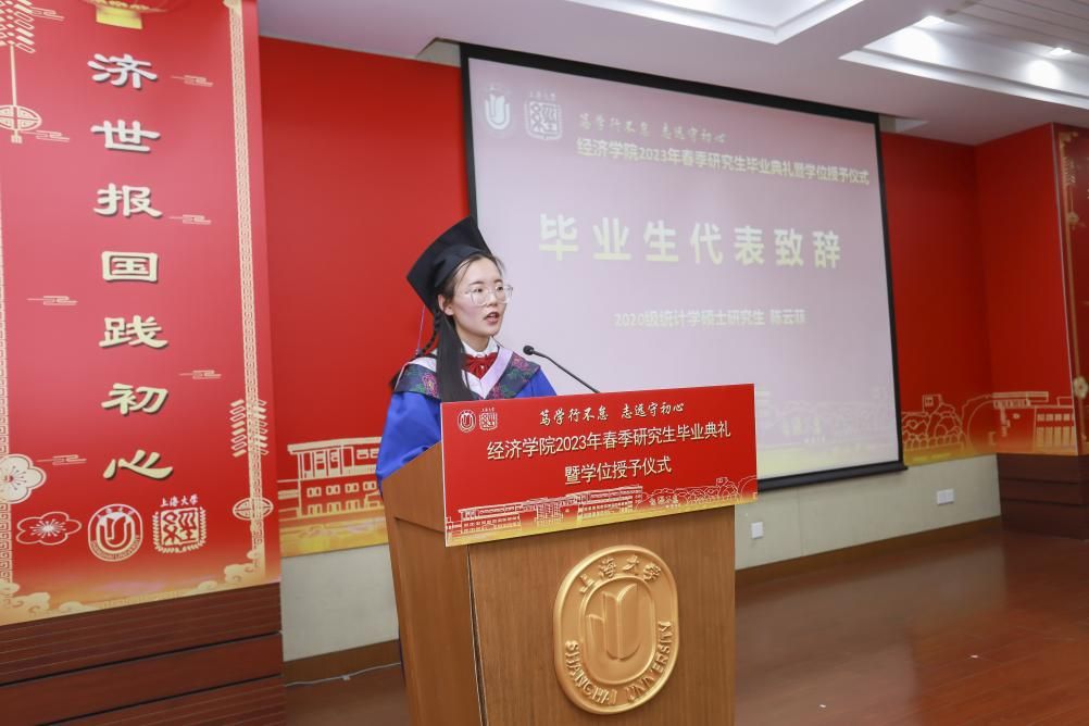 “同窗苦读几度秋,情深义重难割分”。恰同学少年,风华正茂,多年苦读,今朝学有所成,业有所精。毕业生代表、20级统计学陈云菲同学分享了她的成长感悟与心声。她表示在经济学院攻读硕士学位的近三年时光,是培养我们独立思考和解决问题能力的“蜕变期”;也是让我们不断坚定青年责任与担当意识的“成熟期”,更是我们不断探索、勇敢尝试的“试错期”。希望大家不负青年心中的赤诚与热爱,不负父母和师长的殷殷期望,努力做晨曦中的赶路人,用实际行动去践行“经世济民”的理念,为祖国的强盛而努力奋斗,无愧于这个美好的时代!