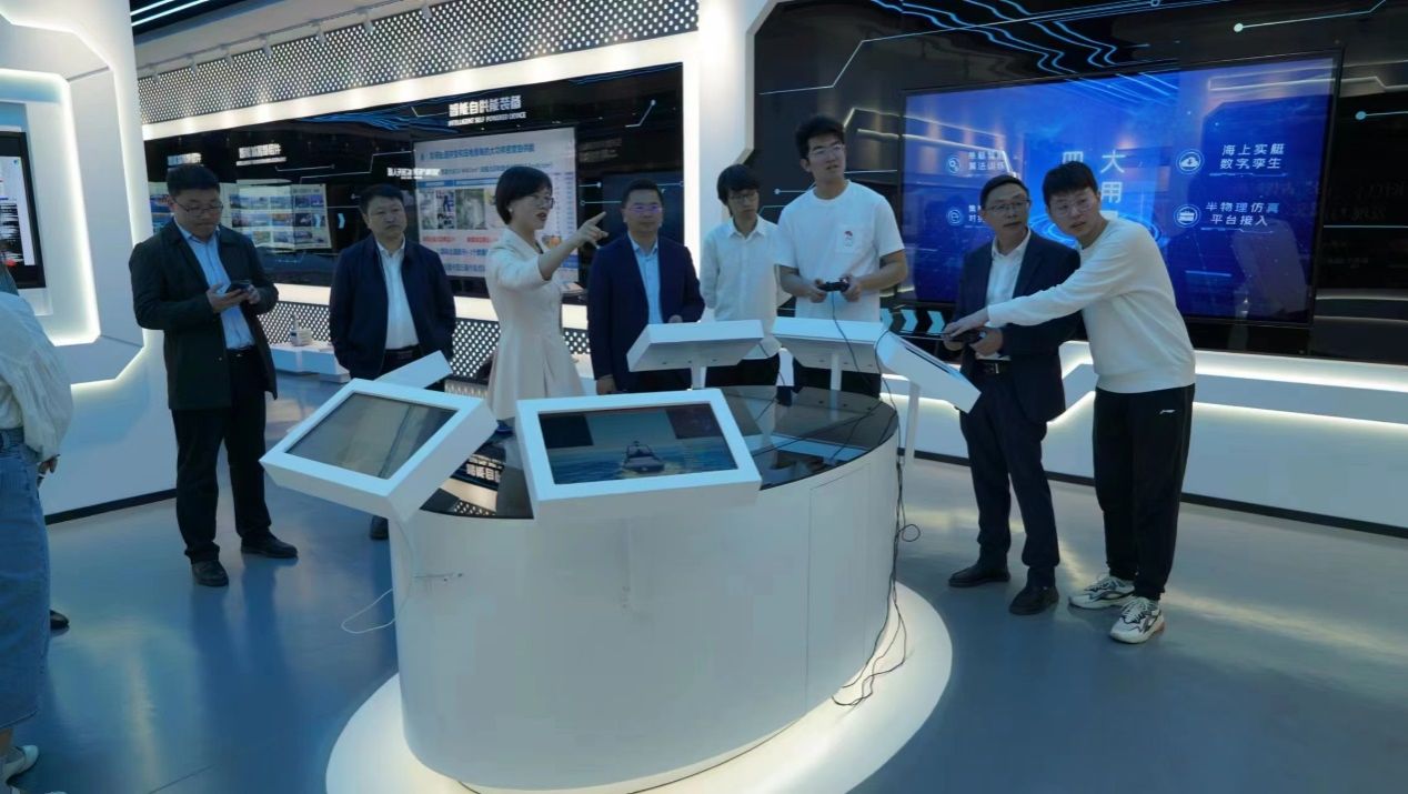 未来技术学院院长彭艳教授为校长们进行了导引讲解,校长们不时询问交流,并亲身体验相关海洋竞技智能设备。