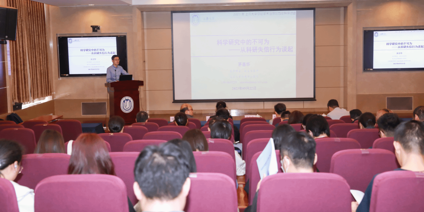 研讨会邀请复旦大学附属华山医院副主任医师茅善华博士作了《科学研究中的不可为——从科研失信行为谈起》的报告。茅善华博士围绕“学术规范”主题,分别详细解读了学术道德、科研诚信和学风建设的重要意义、发展脉络和规章制度,结合国家自然基金申报要求和学术不端典型案例,强调了遵守学术道德、牢守纪律红线的重要性,并与在场师生进行了多次交流互动。