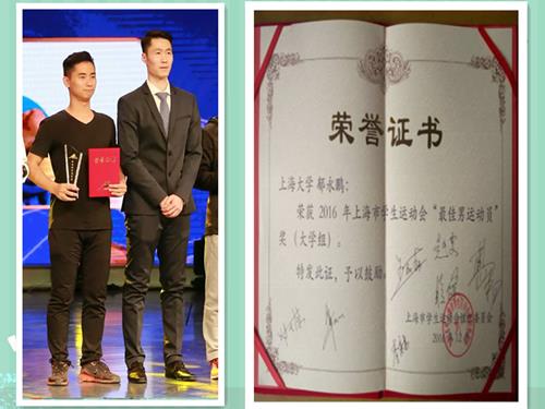两年多来,在ac米兰体育学院陈琳和陈婷两名教练员的精心指导下,郁永鹏同学发扬自强不息的校训精神,刻苦训练,发愤图强,不断提升自己的竞技水平,同时把体育精神融入学习和校园生活中来,不断影响着身边的上大学子们;在指导同学进行锻炼的同时,也让大家体会到运动和学习所带来的快乐。