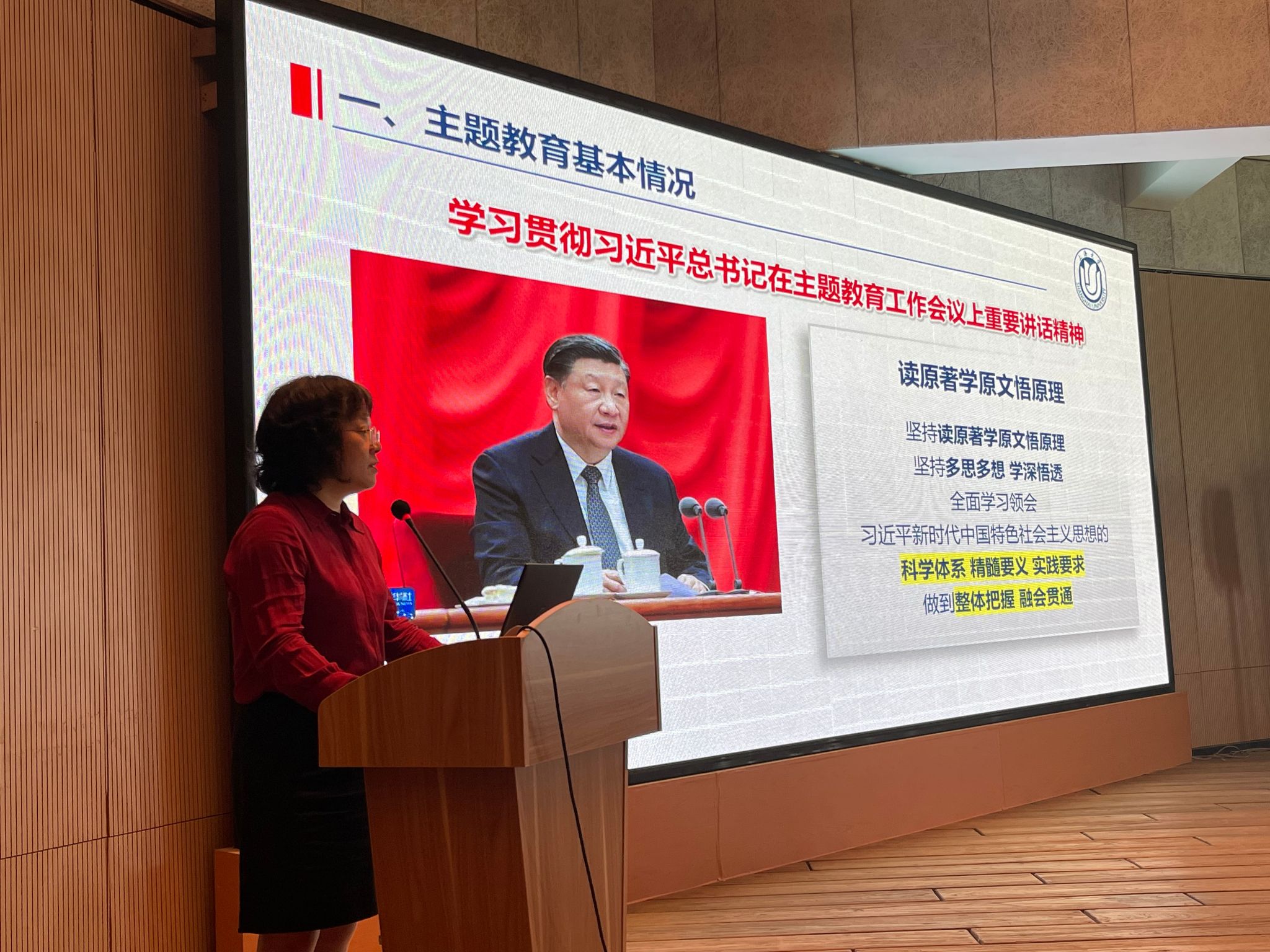 上海美术学院党委书记陈静以“坚持立德树人,办好人民满意的教育”为题,从主题教育基本情况、学习贯彻党的创新理论的收获体会、改进工作的方法举措等三个方面,为全院党员、干部上了一堂生动的专题党课。她指出,要关注师生反映强烈的实际问题,积极推进延长入驻和宝武主校区建设;落实立德树人,加强师德师风建设;探索“两个结合”,推进学院高质量发展。党课立意高远、结合实际、富有启发,对我们进一步深入学习领会习近平新时代中国特色社会主义思想,把主题教育各项工作走深走实具有很强的指导作用。