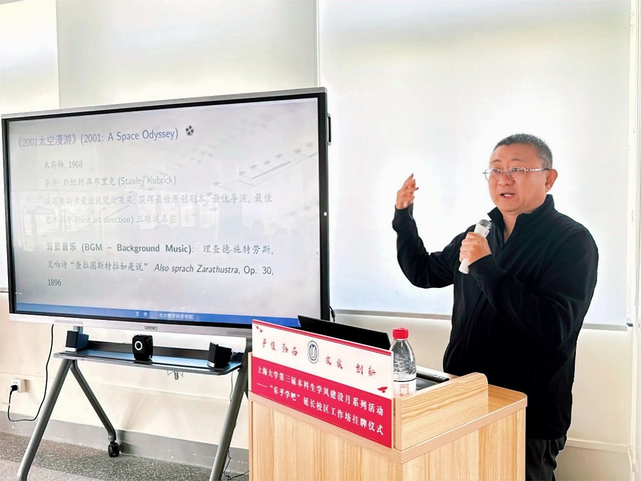 王杰教授的报告围绕“艺术与数学”展开,讲述了乐律与数学的关系,详细介绍了音乐、电影中声音、色彩、波形、旋律与数学的深刻关系,并阐释了艺术与数学之间密切而又往往不为人知的联系。王杰教授渊博的知识,丰厚的艺术素养,感染了在场的所有师生。