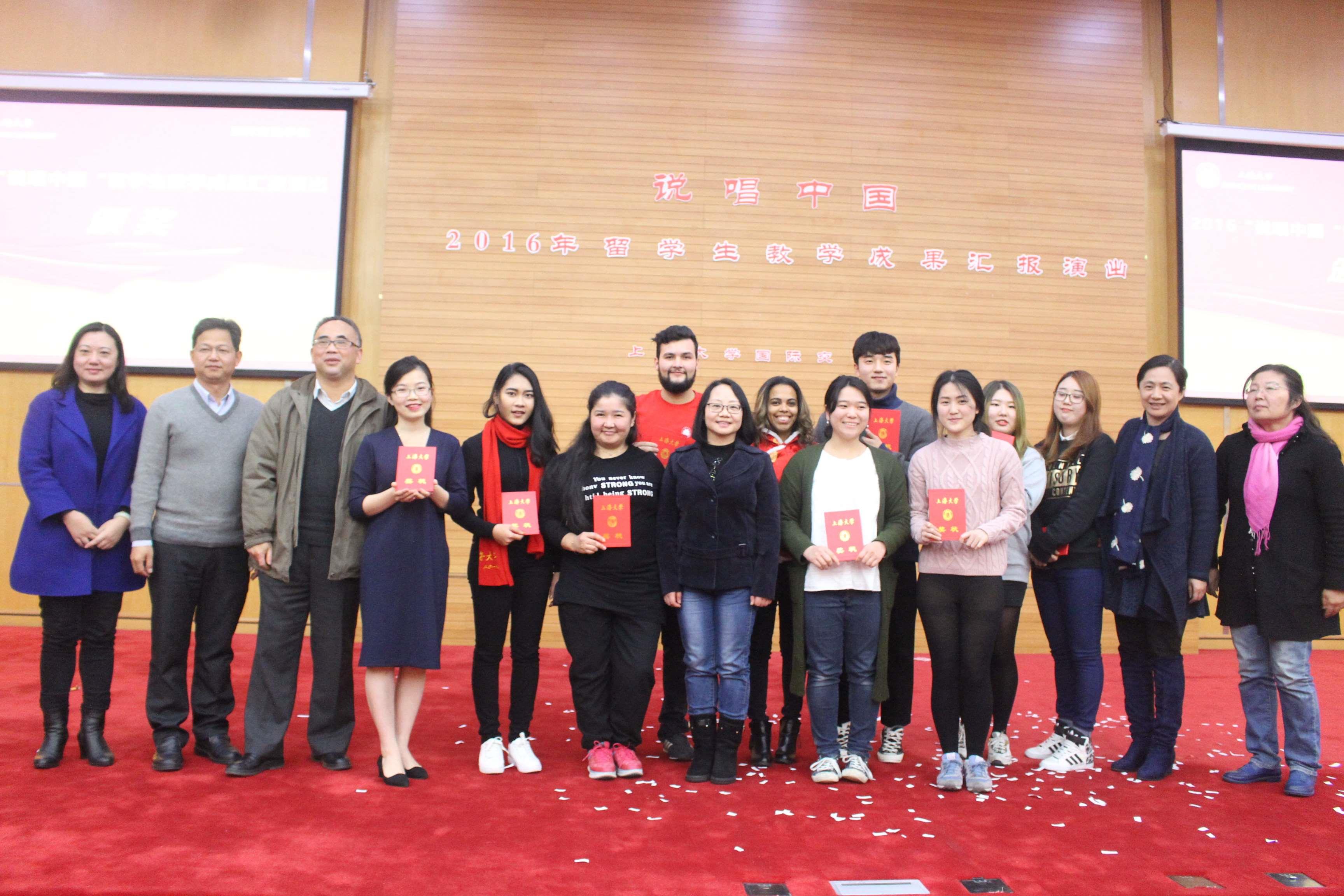 最终,A组语言B1班的表演唱《恭喜恭喜》获得一等奖;语言A1班歌曲《朋友》、语言A3班歌舞《恭喜恭喜》获得二等奖;语言A2班歌舞《最炫民族风》、语言B2班歌曲《青春修炼册》、语言B3班歌舞《广场style》获得三等奖。B组汉硕留学生小品《汉硕爱上大》获得一等奖;本科生小品《红帽公主》获得二等奖;语言C2班小品《东游路上学汉语》、语言D班朗诵《诗话中国》获得三等奖。