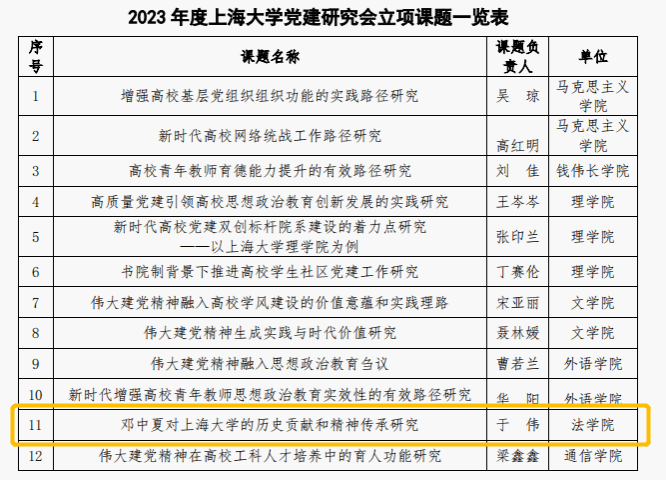 法学院中夏党支部是以邓中夏先烈名字命名的特色党支部,加强邓中夏先烈的革命精神的研究和传扬,既是支部内在建设的需要,也是深入开展主题教育的内在要求。在支部党员、法学院党委副书记、副院长于伟同志的带领下,支部部分党员积极构思选题、多方搜集文献资料,以“邓中夏对ac米兰官网中文网站的历史贡献和精神传承研究”为题积极申报2023年度ac米兰官网中文网站党建研究课题,并获得成功立项。