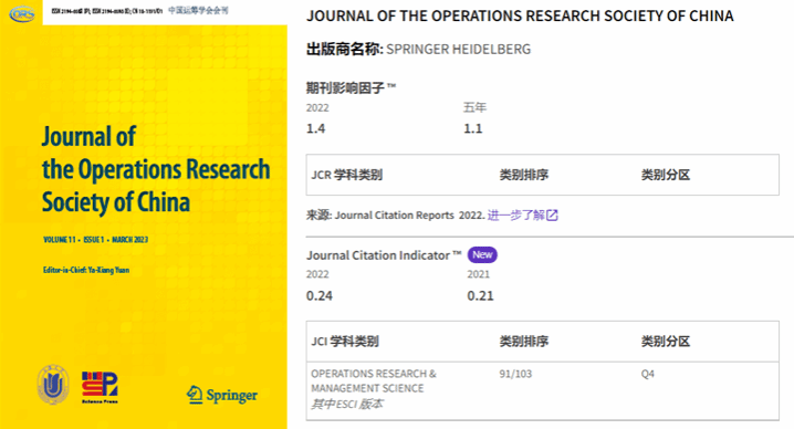《中国运筹学会会刊》今年获得首个影响因子1.4。该刊2022年CiteScore为2.3,较2021年提高43.75%,在全球387本General Mathematics期刊中排名85,较2021年提升了55位,首次成为数学类一区期刊。