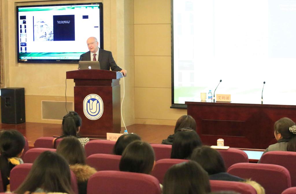 艾朗洛教授的讲座首先对自己的研究方向进行界定,指出明清画家通常会在自己的画作上题诗,这种诗并不包括后来收藏家与鉴赏家的题作,进而探讨画家的题诗与图画本身的交互关系,讲述了三个部分的内容:画家在创作时题自己的诗、画家在创作时题别人(历代名家)的诗、以王时敏、石涛“杜甫诗意图”为中心的比较研究。艾教授以饱含激情的讲演揭示了明清时期题画诗的深刻内涵,细腻地挖掘了诗与画结合的审美特质,给听众带来诗情画意的美感体验。