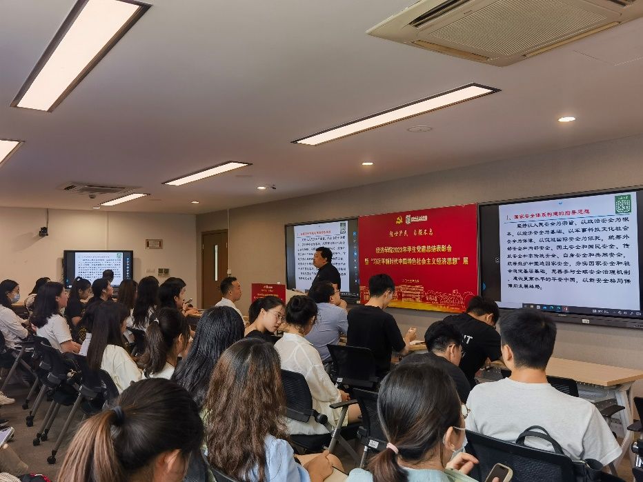 2023年是全面贯彻党的二十大精神的开局之年,正值学习贯彻习近平新时代中国特色社会主义思想主题教育全面开展之际,为庆祝中国共产党成立102周年,传承中国共产党经世济民初心,引导全院经院学子进一步坚定理想信念,经济学院于2023年6月30日下午在经管楼580召开经济学院2023年学生党建总结表彰会暨习近平新时代中国特色社会主义经济思想展。学院党委副书记、常务副院长聂永有,学院党委副书记、副院长冯玉鑫,学院研究生党建中心主任夏唯伟,学院研究生辅导员亢凯、林志强、张博扬出席会议。学院全体研究生、本科生获奖党员以及毕业生党员参加会议。会议由学院研究生党建中心副主任姚烨主持。