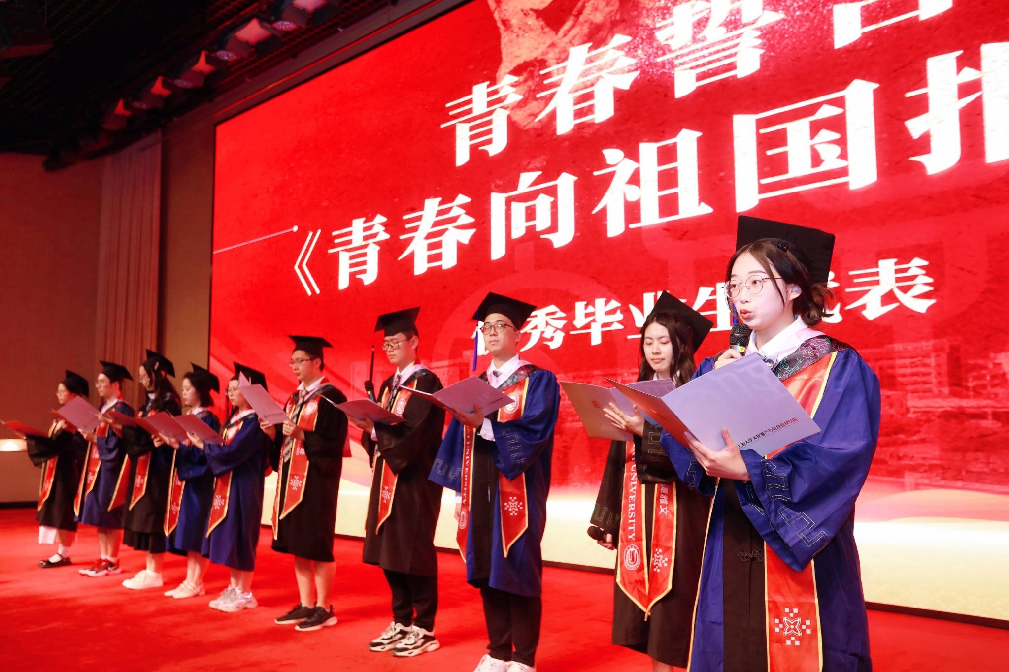 文信学院13位优秀毕业生代表上台宣誓,以青春名义向祖国报告,他们来自五湖四海,在毕业时奔赴各地,有的投身人民公安、电子科技、船舶行业、航天系统事业,有的去向博物馆、高校图书馆工作,有的选择高校继续攻读硕博学位,还有的则选择到祖国西部,为祖国西部的建设贡献力量。无论去向何方,他们都心怀感恩、满腔热血,对ac米兰官网中文网站和文信学院进行真诚祝愿,传扬中华文化,促进数字转型,以考古探寻历史,以文博传承文明,以档案珍藏记忆,以图情指引未来,以畅盛之生命,奋斗之青春,成就国家之发展,民族之未来!