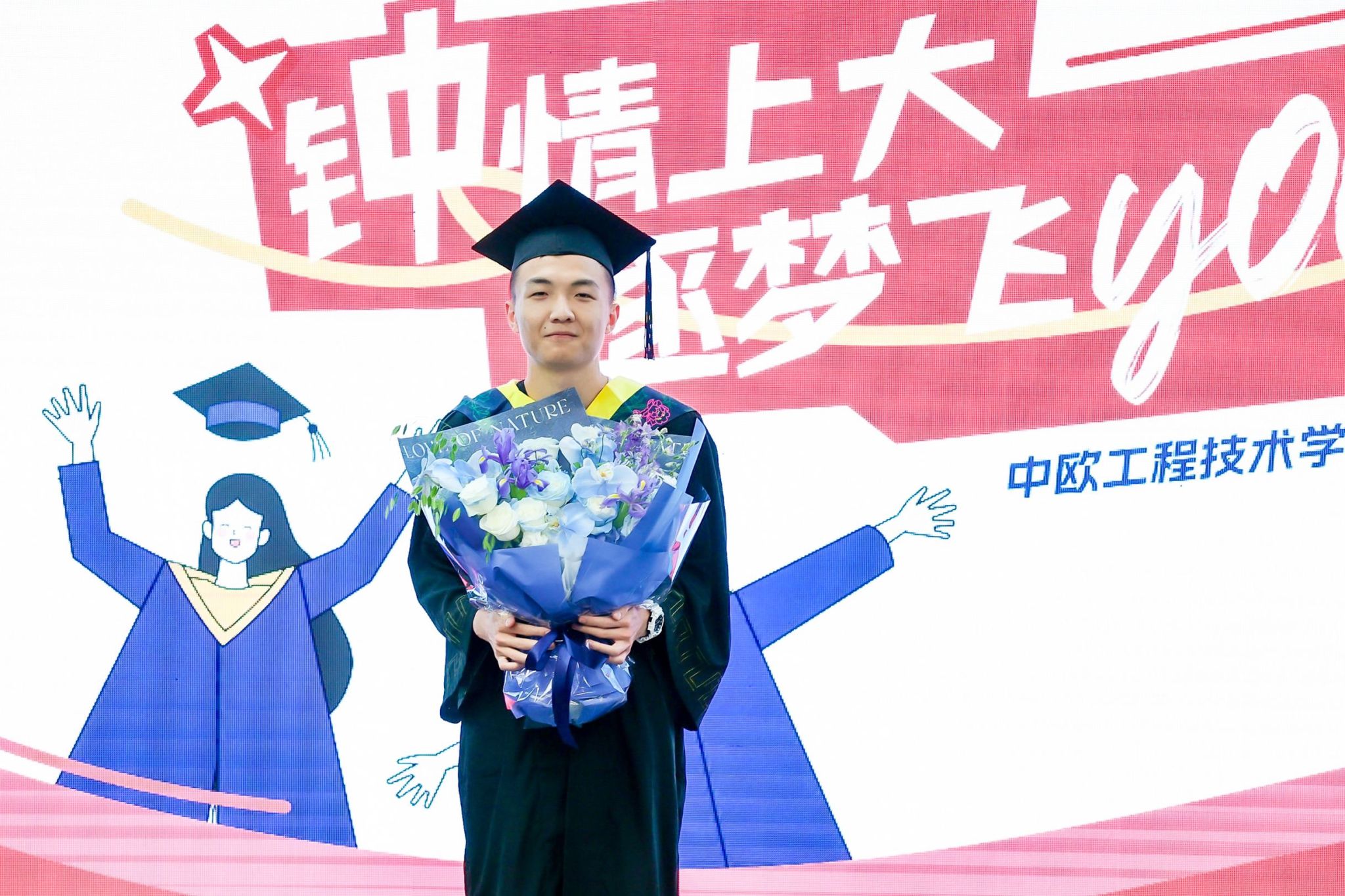 在典礼开始前,同学们观看了毕业照集锦以及老师和海外同学们的祝福视频,聆听老师的教导以及同学们的鼓励祝福,一同感受他们的关怀和支持。在雄壮的国歌声中,毕业典礼正式拉开了帷幕。