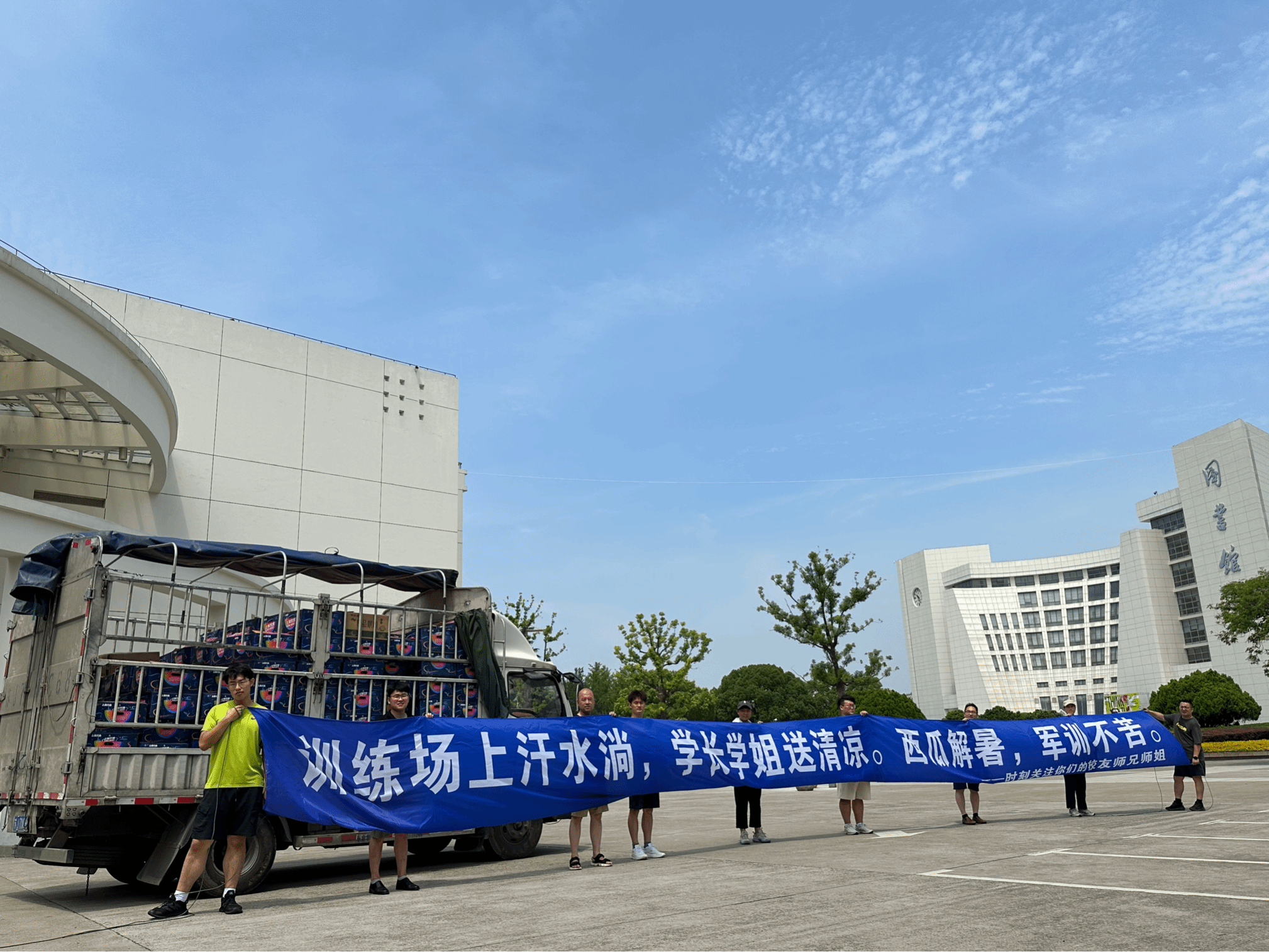 7月14日一早,满载着学长学姐关心的万余斤新鲜西瓜从江苏盐城大丰的田间跨江达海、马不停蹄地运抵学校,此批西瓜是产自上海农场的优质特供西瓜。“搬瓜”现场两条蓝底白字的条幅:“烈日炎炎,有你超甜——来自学长学姐们的夏日慰问”;“训练场上汗水淌,学长学姐送清凉。西瓜解暑,军训不苦。——时刻关注你们的校友师兄师姐”,与一整车万余斤的西瓜组成了军训期间最让人惬意、解暑的画面。