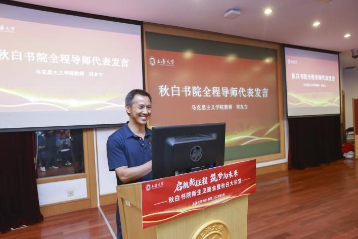 马克思主义学院教师刘友古作为秋白书院全程导师代表讲话。刘友古老师指出,大学是一个锻炼自我的平台,经过汗水和磨练才能铸就大学梦。就多年的文科教学经验,刘老师总结了“经典阅读、追求真理、学会思考、精通语言和勤于写作”五点学习方式,以及“自主的而非奴隶的、自觉的而非催逼的、自强的而非堕落的和自理的而非盲从的”四点人生学习态度,启迪新生们走好未来人生的每一步。