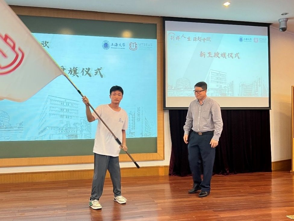 紧接着新生代表潘乐天和毛凤扬分别代表2023级本科生和研究生登台发表了自己的心声。潘乐天同学是家中“第三代上大人”。他向大家分享了他与上大紧密交织的故事,展望了即将展开的大学生涯,并用校训“自强不息”勉励全体同学共同奋进。而毛凤扬同学分享了他正式成为研究生时内心的喜悦。他简单介绍了自己的研究方向,并分享了自己在读研期间的远大理想,希望能为祖国信息科技发展贡献自己的力量。他振奋人心的发言为在场的本科新生开阔了视野,也让大家对我国未来科技事业发展充满信心。