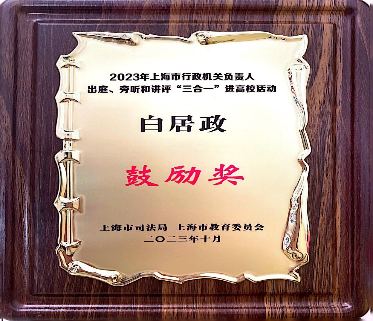 ac米兰官网中文网站荣获行政机关负责人出庭、旁听、讲评“三合一”进高校活动优秀组织奖,法学院白居政同学荣获“三合一”进高校征文活动鼓励奖。