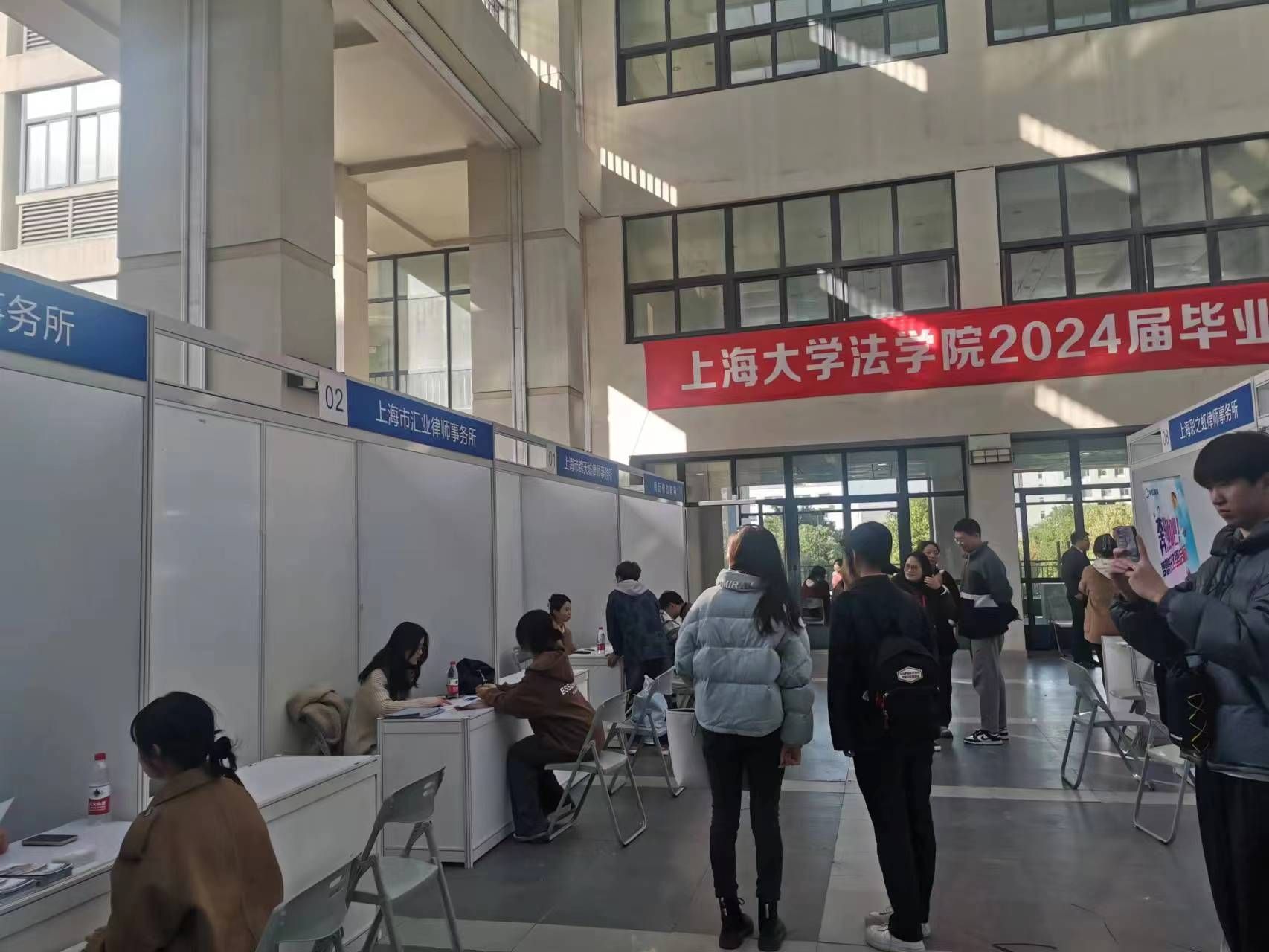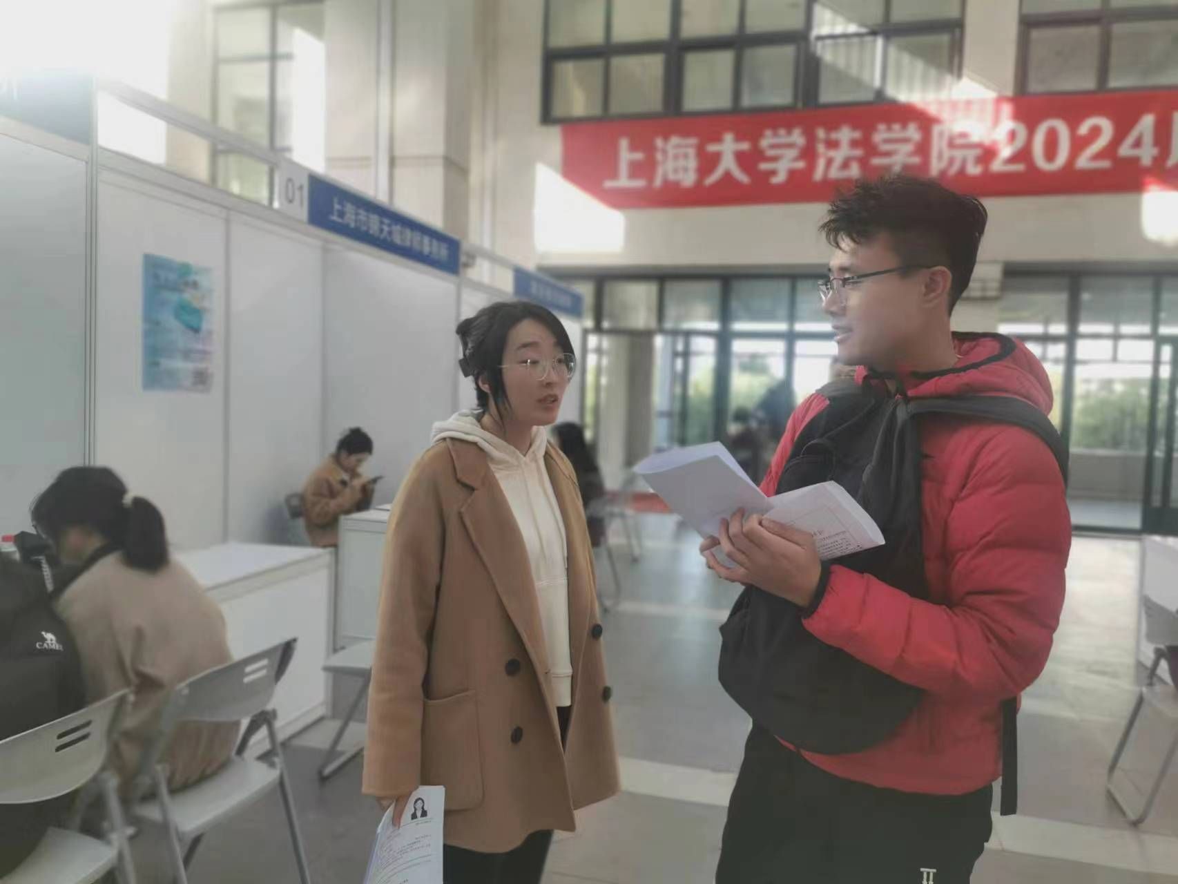 本次招聘会,上海市锦天城律师事务所、上海市汇业律师事务所、上海瀛东律师事务所、合众新能源汽车股份有限公司、北京德和衡(上海)律师事务所、多特瑞(上海)商贸有限公司、上海百一知识产权代理有限公司、上海彩之虹律师事务所、上海尚银律师事务所、上海瑾之润申达律师事务所、上海君赢达律师事务所、泰和泰(上海)律师事务所、北京市集佳律师事务所上海分所、上海国仕律师事务所、北京金诚同达上海律师事务所、上海申凯律师事务所、上海铸达律师事务所、上海金亮律师事务所等十八家知名律所和企业应邀参加,各单位针对法学院的专业特色和学生就业需求,提供了律师助理、公司法务、专利代理人、实习生等多种近百个工作岗位。招聘会吸引了近80名同学参加,同学们积极投寄简历,抓住宝贵就业机会,向用人单位充分展现自己的就业优势和综合能力。