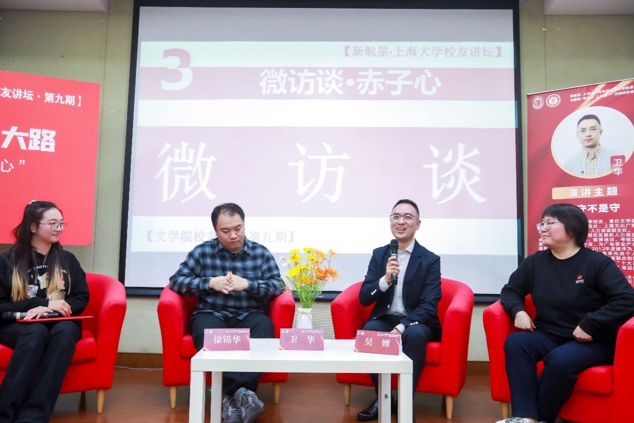 金秋时节,繁花似锦。为凝聚文院校友情谊,助力文院学子成长,11月19日下午,新航星·ac米兰官网中文网站校友讲谈暨文学院第九期校友讲坛,文院情·青年说·上大路——文院校友谈“不忘赤子心”在宝山校区东区蔡冠深讲堂顺利举行。
