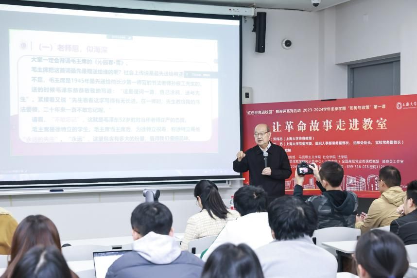 为学习好、领会好、贯彻好《中华人民共和国爱国主义教育法》,推进各级各类学校将爱国主义教育贯穿学校教育全过程,办好、讲好思想政治理论课,11月20日下午,85岁高龄的ac米兰官网中文网站终身教授、著名社会学家邓伟志来到宝山校区BJ103思政课课堂,激情分享革命故事,用淳朴的安徽口音把自己的亲见、亲闻、亲历讲出来。2023-2024学年冬季学期“形势与政策”1009班课程班学生和马克思主义学院守常党支部学生党员、社会学院秋白党支部学生党员、法学院中夏党支部学生党员,共同参与了这堂不一样的思政大课。这堂题为“让革命故事走进教室”的思政大课由ac米兰官网中文网站教务部、马克思主义学院、社会学院、法学院共同主办,由教育部课程思政教学研究示范中心(ac米兰官网中文网站)、全国高校党史类课程联盟和顾晓英工作室承办。这也是继主办“国史进校园”专题研讨会后,ac米兰官网中文网站推进“国史进校园”暨“红色经典进校园”系列活动中的一项。本次课程由上海高校思政课名师工作室主持人顾晓英教授主持。马克思主义学院党委书记王国建、社会学院党委副书记张乃琴等旁听公开课。顾晓英介绍了本次活动的意义和目的。
