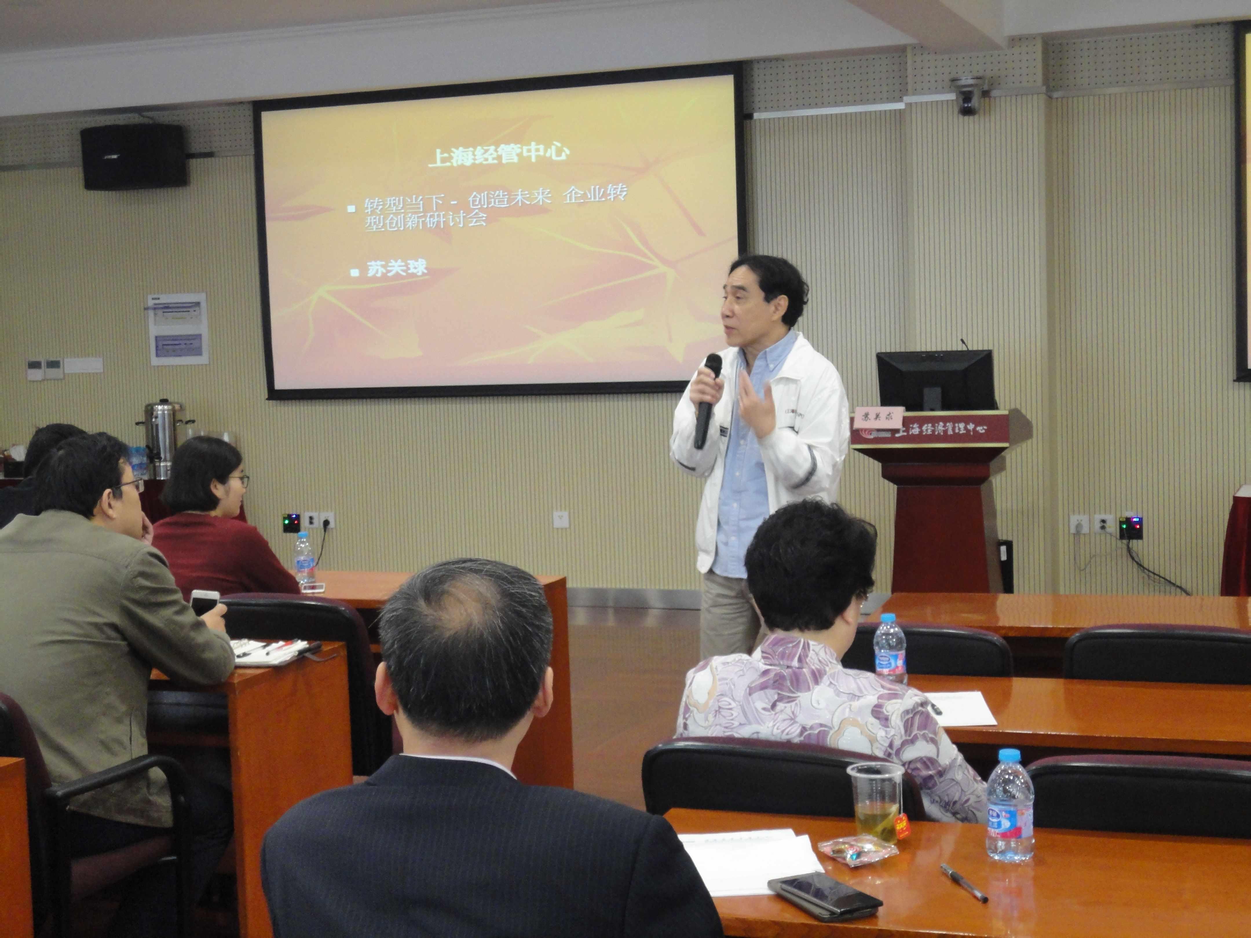 2016年11月19日上午9时30分,由ac米兰官网中文网站上海经济管理中心和上海总工程师协会联合举办的2016年第三期“上经论坛”在延长校区科技楼817室如期举行。本次论坛的主题为“转型当下开创未来,企业转型的创新途径”,上海经济管理中心副主任,香港浸会大学教授、香港大学潘锦溪商业研究学院首席顾问、香港瑞安集团顾问苏关求先生担任本次论坛的主讲人,三十余位来自上海各界的企业家出席本次论坛。