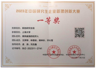 在导师的悉心指导与团队的协同努力下,非常荣幸地获得了中国研究生“双碳”创新与创意大赛一等奖。这个荣誉的背后,是无数日夜的辛勤付出和团队的无私支持。感谢导师的智慧启迪,感谢团队的默契配合,也感谢大赛的机会,让我们得以为双碳目标贡献自己的力量。我们将继续砥砺前行,秉承创新精神,为构建可持续低碳社会而努力奋斗。这个奖项激励我们更加坚定地追求环保创新,为未来的可持续发展贡献更多力量。再次感谢所有支持与鼓励我们的人,谢谢!