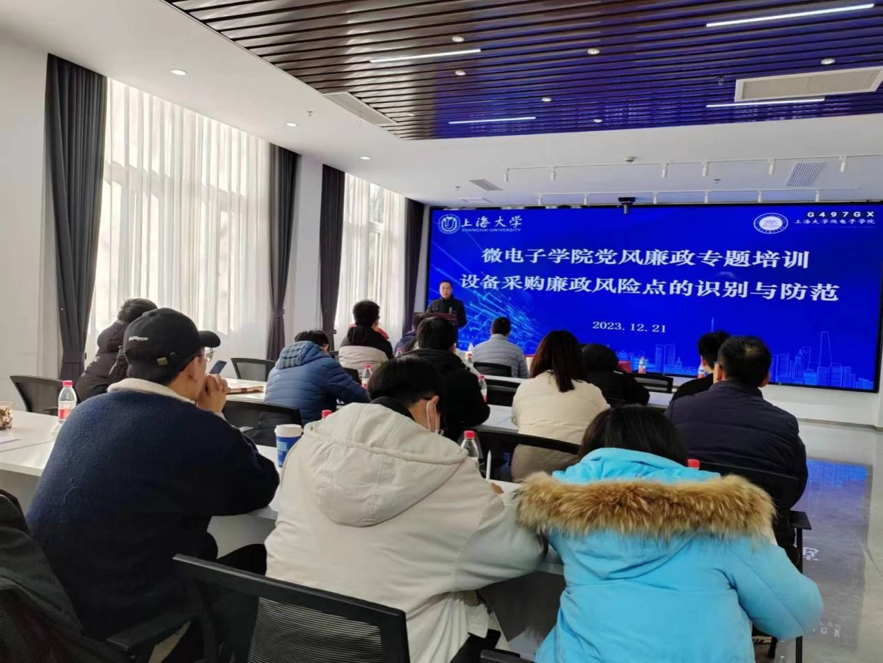 为深入推进全面从严治党,强化教职工廉洁自律意识,努力营造干事创业、风清气正的政治生态,12月21日,微电子学院党委在A楼101会议室开展设备采购廉政风险点的识别与防范党风廉政建设专题培训。微电子学院党委书记郭纯生,党委副书记、副院长、纪检员袁铭,副院长周婷,以及学院学科团队负责人、新进教师、行政管理人员参加培训。培训由袁铭主持。