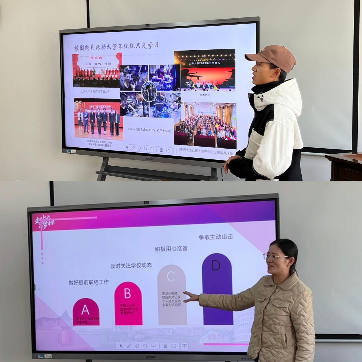 为了让同学们更好地开展宣讲实践活动,培训会邀请了去年参与该活动的任元昌同学和大家一起交流分享,任同学毕业于贵州省兴义市第八中学,他分享了宣讲经历和感悟,介绍了宣讲的前期准备、宣讲技巧和注意事项以及如何撰写最后的实践报告等。公老师对本次实践活动的具体流程与安排,进行了详细讲解,对贵州省近几年的招生录取情况给同学们做了详实的数据分析,并鼓励同学们积极报名参与“把上大说给你听”的主题征文活动。