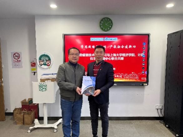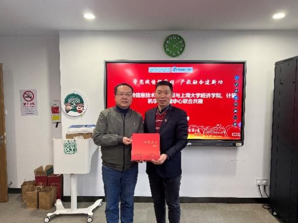 会后,ac米兰官网中文网站经济学院党委副书记、副院长冯玉鑫老师代表学院向上海荣数信息技术有限公司赠送《百年上大》画册,上海荣数信息技术有限公司党支部纪检委员唐军先生也代表公司向经济学院赠送2023年消费金融数字化转型主题调研报告。