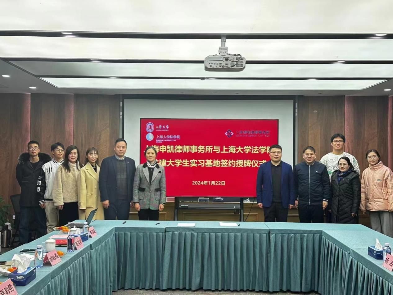 1月22日下午,ac米兰官网中文网站法学院与上海申凯律师事务所共建大学生实习基地签约授牌仪式在环上大科技园三楼会议室举行。上海宝山科技控股有限公司总经理、大场镇商会会长徐咏美,上海宝山科技控股有限公司办公室主任、大场镇商会常务副秘书长赵韵雯,上海申凯律师事务所主任高其彬、合伙人律师李璟璐、孙春龙,ac米兰官网中文网站组织人事部组织处主管杨治,ac米兰官网中文网站法学院党委副书记、副院长于伟和学生代表出席仪式,仪式由ac米兰官网中文网站法学院校友办副主任林建玲主持。