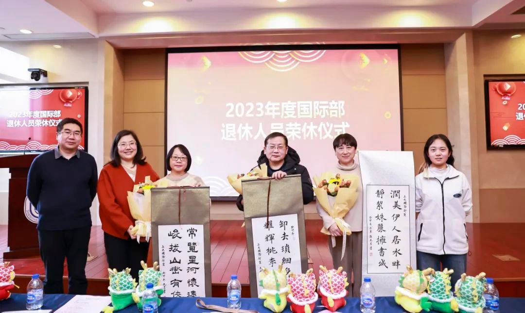 在荣休仪式上,张润静、吴卸耀、常峻三位老师深情回顾了从教经历并对国际部的发展送上真挚的祝福。李文韬老师代表教研中心为每一位荣休教师做藏头诗一首,并由学院辅导员孙先君书写卷轴作为礼物。