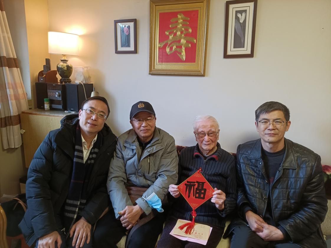 在学院离休干部李学翔老师家,99岁高龄的李老师精神矍铄,老师们津津有味地聆听李老师谈起曾经在学校的工作生活,孟添感谢李老为学校及学院建设发展作出的贡献,并给他拜年送上新年祝福。