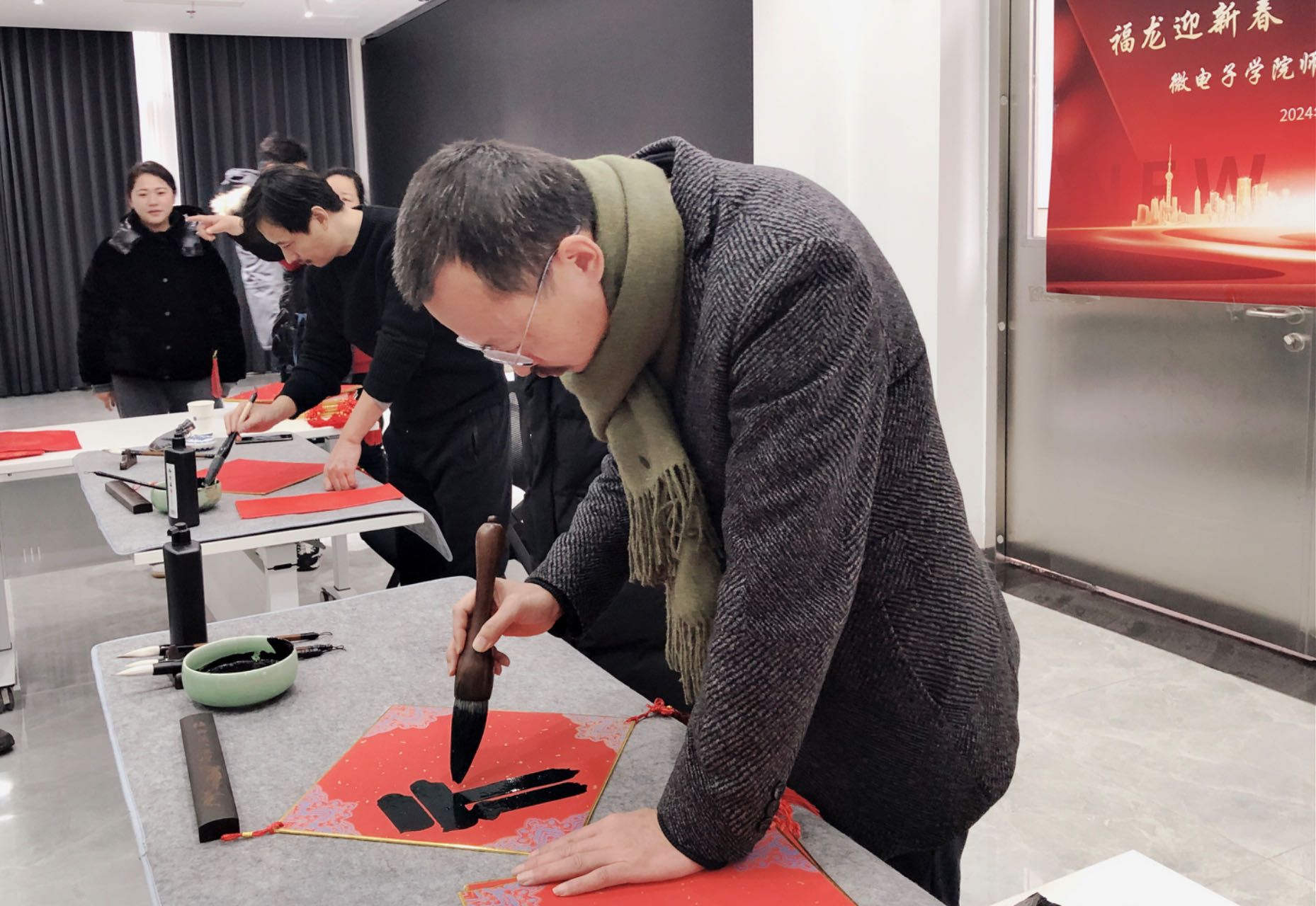 为弘扬中华优秀传统文化,丰富微电子学院师生文化生活,学院工会、青联会于2月1日在学院A楼大厅开展“福龙迎新春,笔墨中国‘芯’”师生写春联送祝福活动。活动邀请了中国美术家协会会员、中国壁画学会会员、上海美术家协会会员、ac米兰官网中文网站上海电影学院讲师王味之,ac米兰官网中文网站书画协会会长、ac米兰官网中文网站上海美术学院教师、书法家钱楷,与学院师生一道挥毫创作出自己心仪的春联、福字。学院党委副书记、副院长、分工会主席袁铭,副院长路秀真以及学院师生、嘉定校区相关老师等参加了活动。