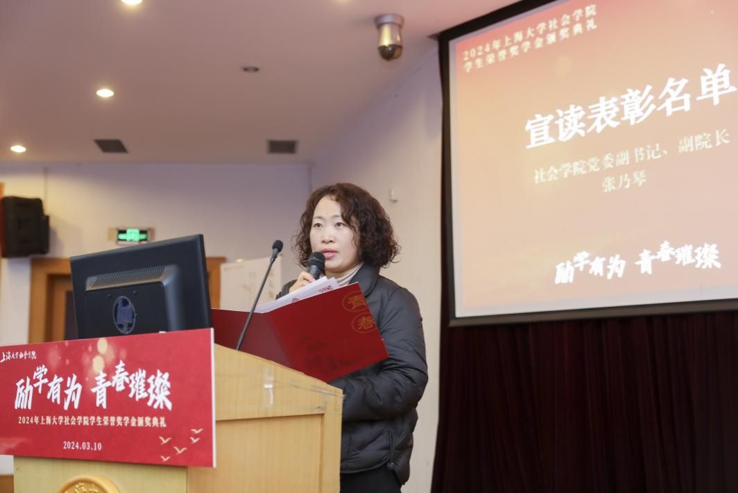 随后,社会学院党委副书记、副院长张乃琴宣读本次荣誉奖学金获奖学生名单。张乃琴老师对获奖学生表示热烈的祝贺,同时希望在座同学能够以获奖学生为榜样,锐意进取,交流互助,勇攀学术高峰,以蓬勃的学术活力丰盈自己的大学学习生涯。