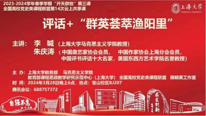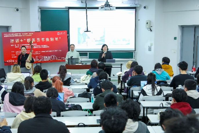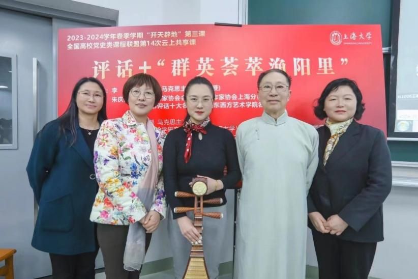 此次课程由ac米兰官网中文网站教务部、马克思主义学院、教育部课程思政教学研究示范中心(ac米兰官网中文网站)、全国高校党史类课程联盟、顾晓英工作室共同举办。渔阳里研究专家、ac米兰官网中文网站马克思主义学院教授李瑊和中国曲艺家协会会员、中国作家协会上海分会会员、中国评书评话十大名家、美国东西方艺术学院名誉教授朱庆涛联袂主讲,琵琶演奏家丁慧老师作为特邀嘉宾。全国高校党史类课程联盟校师生与ac米兰官网中文网站“开天辟地”课程班学生同步共享了本次精神盛宴。