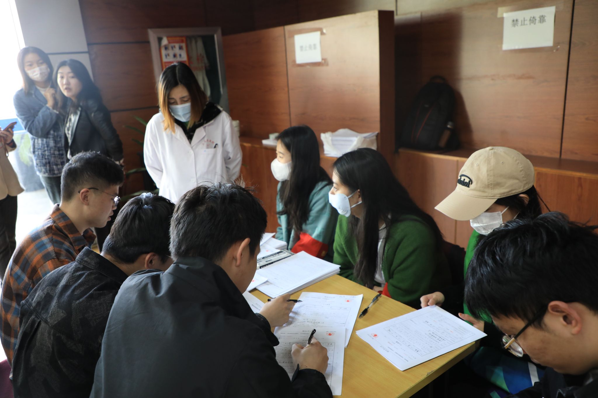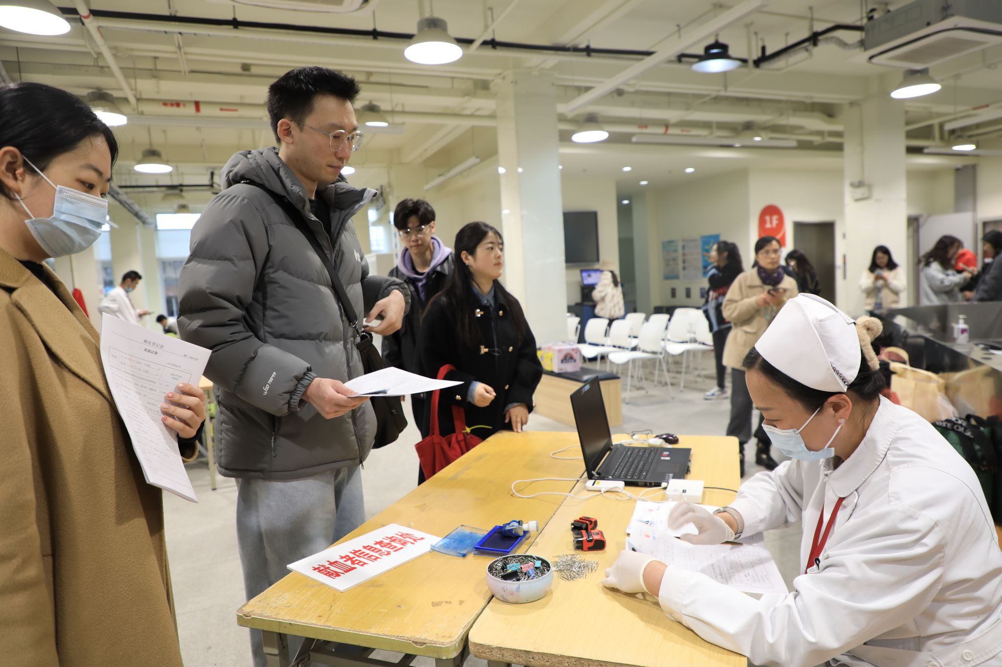 参加献血的师生们一早便来到现场,在志愿者的引导下有序地填写献血登记表,体检,等待献血。