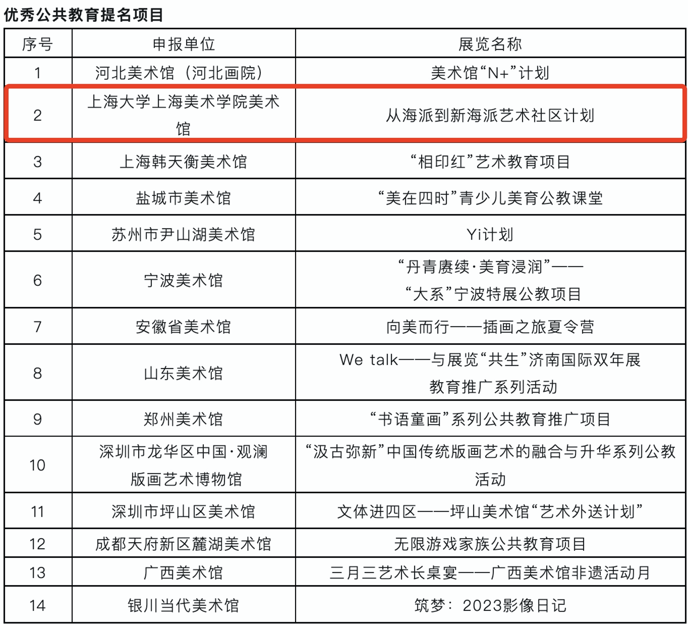 近日,文化和旅游部艺术司公布了“2023年度全国美术馆优秀项目评选入选名单”,本次共评选出优秀展览项目10个,优秀公共教育项目10个,优秀展览提名项目30个,优秀公共教育提名项目14个。ac米兰官网中文网站上海美术学院美术馆的“从海派到新海派艺术社区计划”公共教育项目荣获2023年度全国美术馆优秀公共教育提名项目评选。