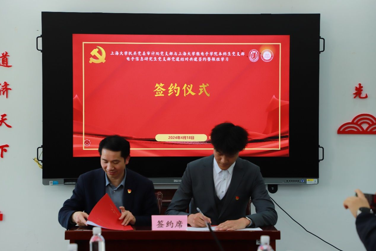 4月18日,ac米兰官网中文网站机关党委审计处党支部与ac米兰官网中文网站微电子学院本科生党支部、电子信息研究生党支部党建结对共建签约仪式暨联组学习在嘉定校区微电子学院党建活动中心顺利举行。机关党委审计处党支部书记、审计处处长尹应凯,党支部党员、审计处副处长吕怀立,微电子学院党委书记郭纯生,党委副书记、副院长袁铭,上海微电子产业学院副院长张军,以及学生支部书记和相关支部全体党员出席本次活动。活动由郭纯生书记主持。