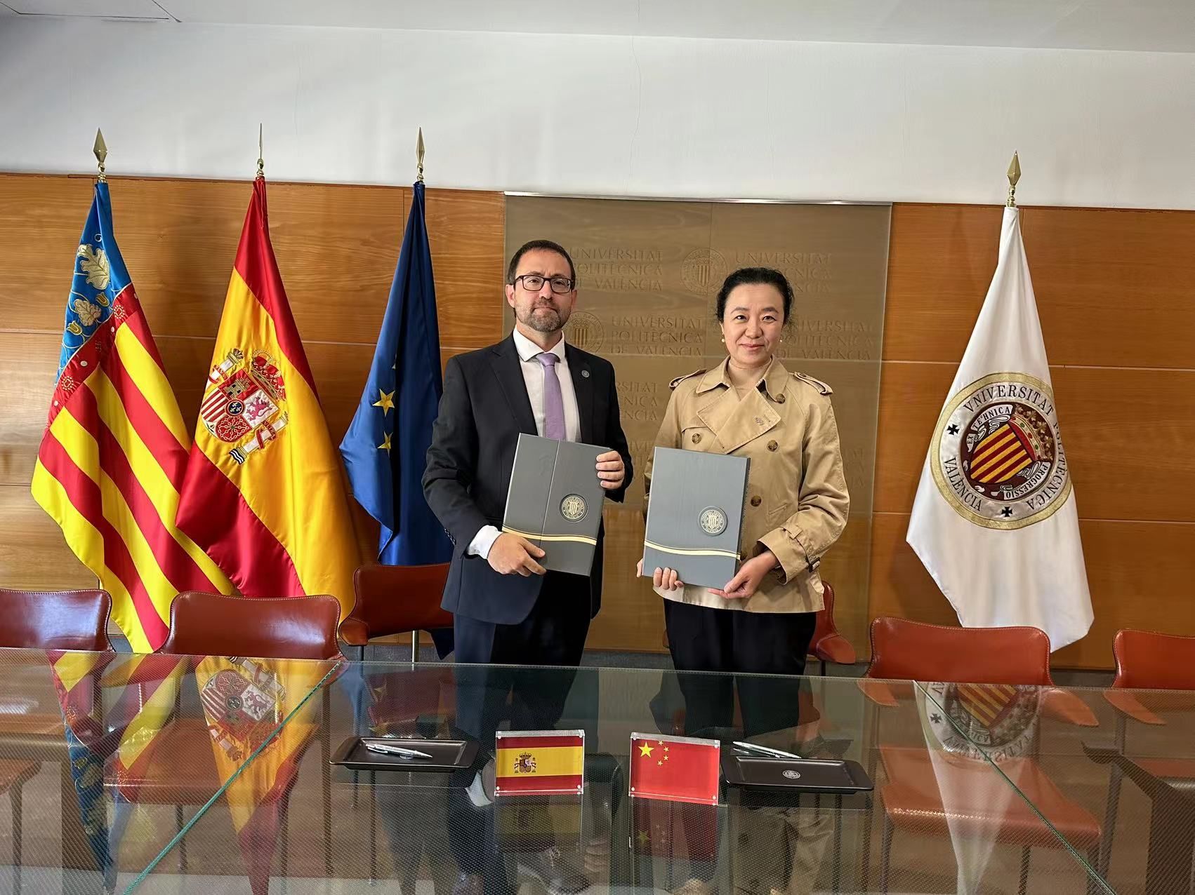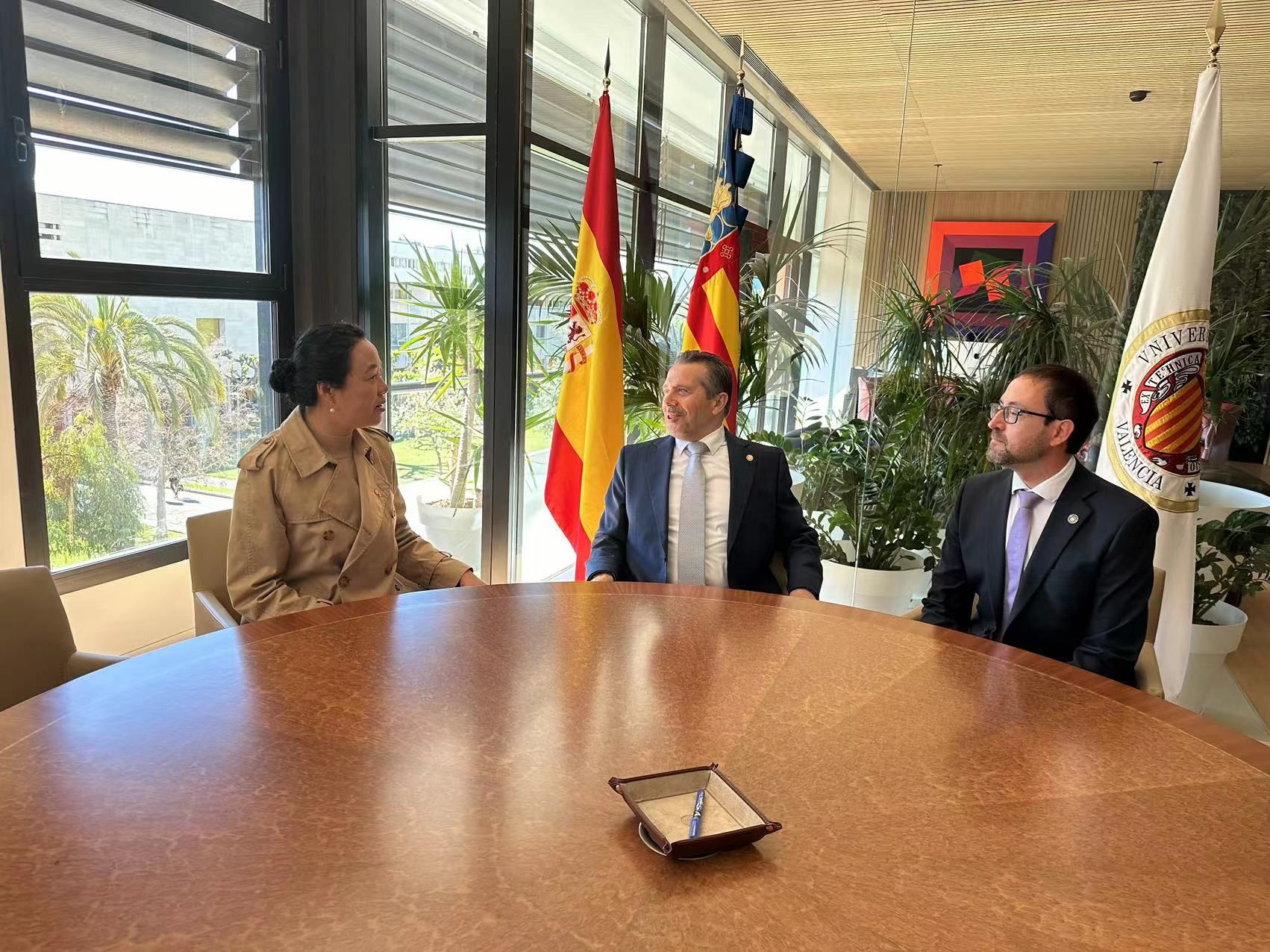 在瓦伦西亚期间,代表团一行拜访了瓦伦西亚理工大学。瓦理工校长何塞·埃斯特万(Jose Esteban)会见代表团一行,并表示,上大校领导半年内率团回访是对双方合作的高度重视和务实之举。于雪梅副校长与瓦理工副校长何塞·弗朗西斯科(JoseFrancisco)签署了校际交流框架协议和学生交流协议。瓦理工国际处负责人、终身教育中心主任等就南美高校-瓦理工-上大三方学生联合培养、欧盟“微证书”课程合作开发等事项与代表团交换了意见。