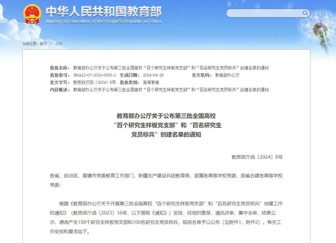 近日,《教育部办公厅关于公布第四批全国党建工作示范高校、标杆院系、样板支部培育创建单位名单的通知》(教思政厅函〔2024〕7号)和《教育部办公厅关于公布第三批全国高校“百个研究生样板党支部”和“百名研究生党员标兵”创建名单的通知》(教思政厅函〔2024〕8号)公布。