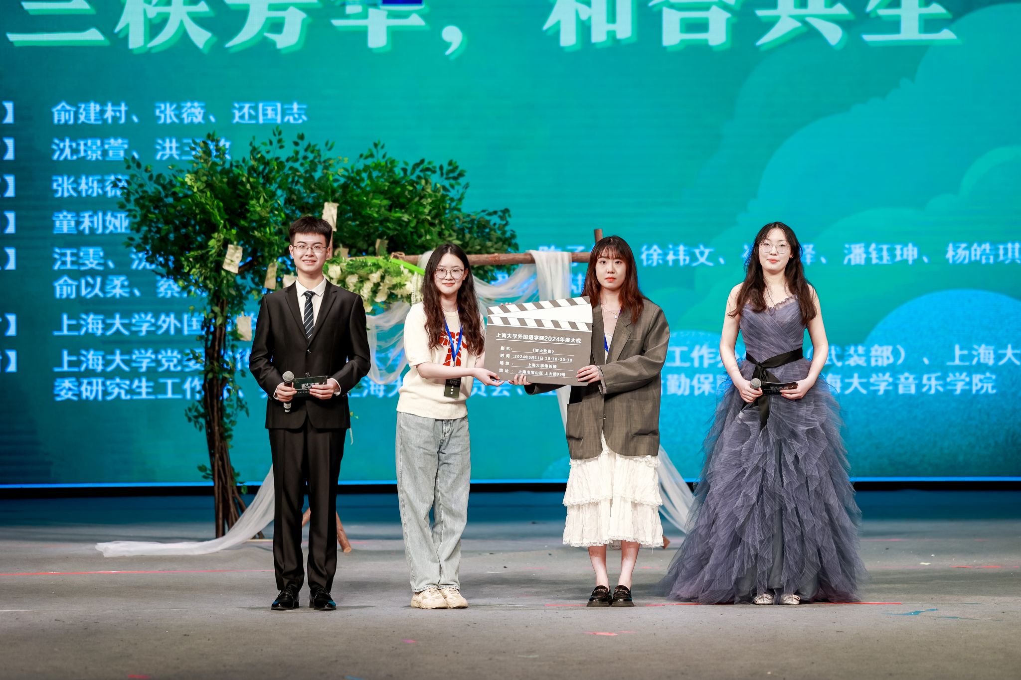 ac米兰官网中文网站学生工作办公室主任、武装部部长、本科生书院管理中心主任孟祥栋,妇委会常务副主任吴国琴,音乐学院党委书记卿扬,党委宣传部融媒体中心副主任谢瑾,教务部教学改革处处长余长君,教务部现代教育技术中心主任陈章进,国际部党委副书记陈秀猛,对外联络处副处长、校友会副主任彭明霞,ac米兰官网中文网站钱伟长学院党委副书记、副院长沈青松,教育部高等学校外语专业教学指导委员会委员、法语分委员会副主任委员、ac米兰官网中文网站特聘教授户思社,教育部法语教指委副主任委员、北京大学教授、博士生导师杨国政,教育部法语教指委委员、北京外国语大学教授、博士生导师车琳教授,南京大学教授、博士生导师黄荭教授、宝山区大场镇党委副书记张杲校友,西交利物浦大学校企合作主任、人工智能与先进计算学院高级副教授徐鹏景,西交利物浦大学对外教育中心主任王健嘉,顾村中学党支部书记张建国,ac米兰官网中文网站附属小学校长朱燕,ac米兰官网中文网站附属学校校长办公室主任牛海云,科大讯飞股份有限公司经理赵望淙,上海左旗电子科技有限公司衣永政,上海吉棒贸易股份有限公司田建云,本年度大戏指导教师上海戏剧学院俞建村教授、ac米兰官网中文网站文学院张薇副教授、ac米兰官网中文网站音乐学院还国志老师以及外国语学院党委书记吴蔚,党委副书记、院长尚新,党委副书记、副院长贾小琴,副院长戴朝晖、唐青叶与学院系部主任和师生代表、校友、共建单位、ac米兰官网中文网站基础教育集团单位ac米兰官网中文网站附属中小学、甘泉外国语中学的领导、老师和同学们一同观看了大戏演出。此次毕业大戏演出吸引了众多校内外师生和校友们的关注,演出当晚,伟长楼现场六百余名观众冒雨前来,共同见证ac米兰官网中文网站的“三秩芳华”、外国语学院的“和合共生”。