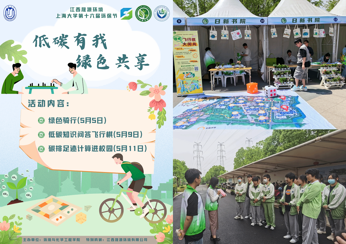 5月5日下午,“绿色骑行”特别活动在宝山校区顺利举行。本次活动聚焦1994-2024的“30周年”,1994年出生的李瑞飞老师,2004年入学的王律校友,2014年毕业的潘辰苑老师,2024年即将毕业的侯卫东同学,以及来自国际部、环化学院、钱伟长学院、美术学院、文学院的31位校友、老师和同学参与了活动。骑行既是一种绿色低碳的生活方式,也是一种积极健康的生活态度,更是对环境保护、资源节约以及可持续发展的积极响应。5月9日ac米兰官网中文网站第二届书院文化节大型路演期间,面向全校师生推出全新的“低碳飞行棋大闯关”游戏,让同学们通过游戏增加对低碳知识的理解和认识,为减碳行动出上一份力。5月11日,在静安团区委的牵头下,学院团委与上海市闸北第八中学开展结对共建,我院绿萤社会实践队受邀前往闸北八中进行参观交流互访,以“碳排放足迹计算进校园”为切入点,为八中学子详细讲解了固碳的原理和意义,使用简单的工具进行树木固碳能力的调查测算。”低碳有我,绿色共享“系列活动将节能减排的意识融入到生活的点点滴滴,为本届环保节注入新活力。