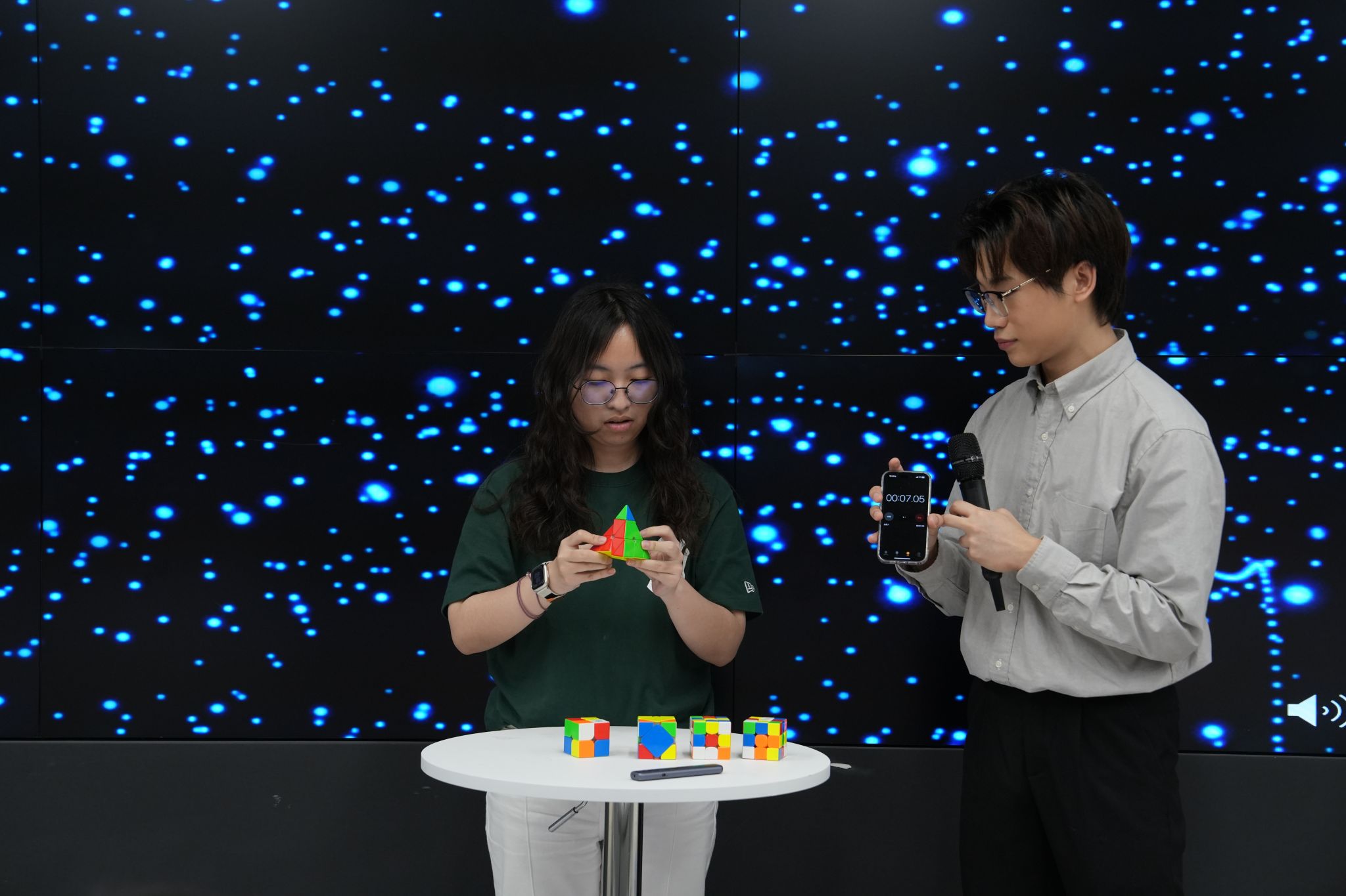 接下来,奥致奥学业奖学金获得者徐珍怡同学带来了一场精彩的魔方表演。她在桌面上放置了5枚各具特色的魔方,只见手指翻飞间,大小形状不一的魔方便在她的手下快速恢复原样,在一分多钟的时间里给观众以极大的震撼,也体现了新传学子在速度和效率上的卓越追求。
